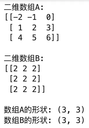 # 练习2.1:创建两个相同形状的二维数组# 创建数组A,形状为3×3# 【思考:如何用NumPy创建二维数组?有哪些方法?】# ⬇️我的思考:Numpy创建二维数组,跟一维数组类似,也是用np.array(),# 只不过里面的元素由[[a],[b],...,[n]]构成A = np.array([[-2, -1, 0],[1, 2, 3],[4, 5, 6]])# 创建数组B,形状为3×3B = np.array([[2, 2, 2],[2, 2, 2],[2, 2, 2]])print("二维数组A:")print(A)print("\n二维数组B:")print(B)print("\n数组A的形状:", A.shape)print("数组B的形状:", B.shape)print()