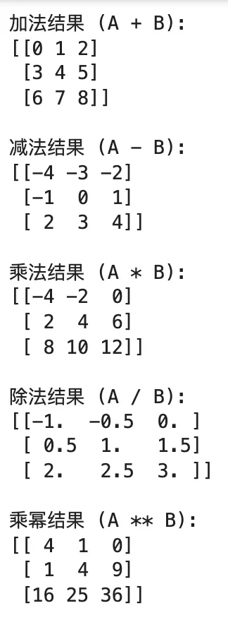 # 练习2.2:实现二维数组的逐元素运算# 1. 加法add_2d = A + B # 沿用跟一维数组类似的结构print("加法结果 (A + B):")print(add_2d)print()# 2. 减法sub_2d = A - Bprint("减法结果 (A - B):")print(sub_2d)print()# 3. 乘法(非矩阵乘法)mul_2d = A * Bprint("乘法结果 (A * B):")print(mul_2d)print()# 4. 除法(自动排除除数为0的情况)div_2d = A / Bprint("除法结果 (A / B):")print(div_2d)print()# 5. 乘幂power_2d = A ** Bprint("乘幂结果 (A ** B):")print(power_2d)print()
