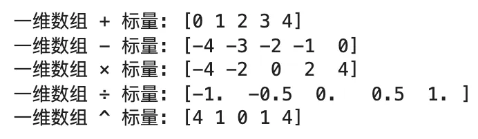 # 实现标量与数组的五种运算# 【思考:标量如何与数组的每个元素进行运算?】scalar_add = arr_1d + scalar # 【提示:直接用 + 运算符】scalar_sub = arr_1d - scalar # 【提示:直接用 - 运算符】scalar_mul = arr_1d * scalar # 【提示:直接用 * 运算符】scalar_div = arr_1d / scalar # 【提示:直接用 / 运算符】scalar_power = arr_1d ** scalar # 【提示:直接用 ** 运算符】print("一维数组 + 标量:", scalar_add)print("一维数组 - 标量:", scalar_sub)print("一维数组 × 标量:", scalar_mul)print("一维数组 ÷ 标量:", scalar_div)print("一维数组 ^ 标量:", scalar_power)print()