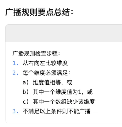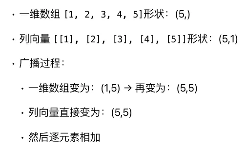 # 练习2.7:广播原则的边界情况# 测试一些广播规则test_cases = [(np.array([1, 2, 3]), np.array([[1], [2], [3]])), # (3,) 和 (3,1)(np.array([[1, 2, 3]]), np.array([[1], [2], [3]])), # (1,3) 和 (3,1)(np.array([1, 2, 3]), np.array([1, 2])), # 不兼容的形状]print("广播规则测试:")for i, (arr1, arr2) in enumerate(test_cases, 1):print(f"\n测试案例 {i}:")print(f"数组1 形状: {arr1.shape}")print(f"数组2 形状: {arr2.shape}")try:# 【提示:尝试相加】result = arr1 + arr2# ⬆️问了AI,才知道可以用如此简洁的方式,尝试将不同形状的数组相加~print("可以广播,结果形状:", result.shape)except ValueError as e:print(f"不能广播: {e}")