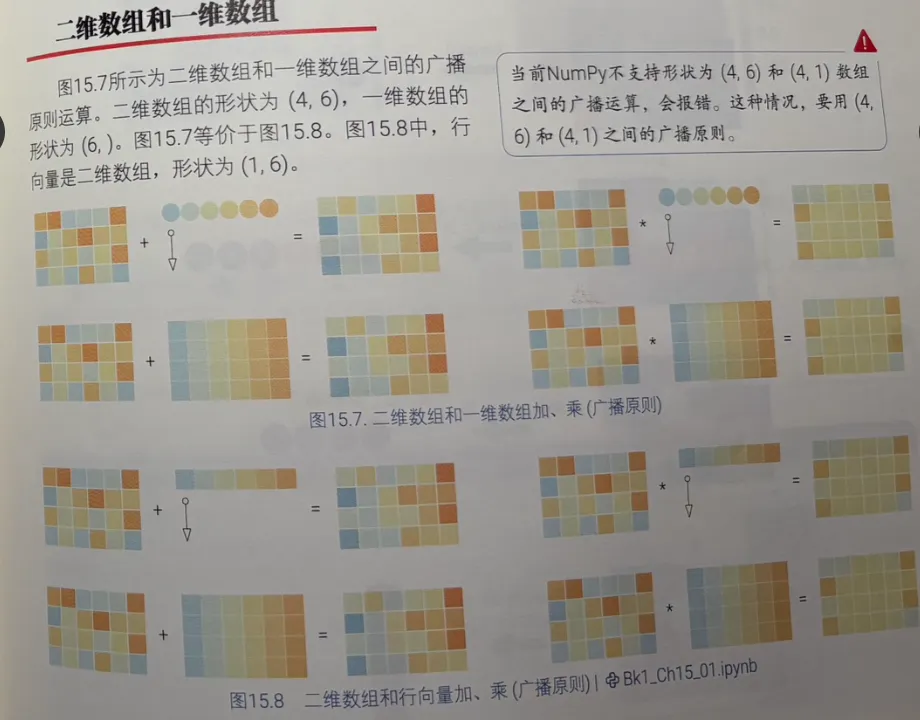 1️⃣书本主要探讨了二维数组和列向量在加法和乘法方面的广播原则。