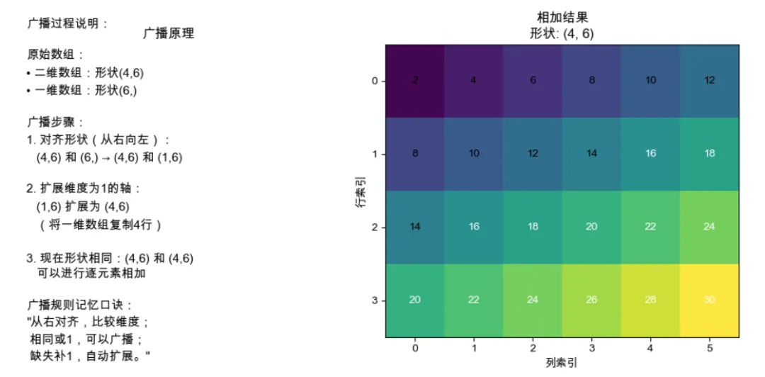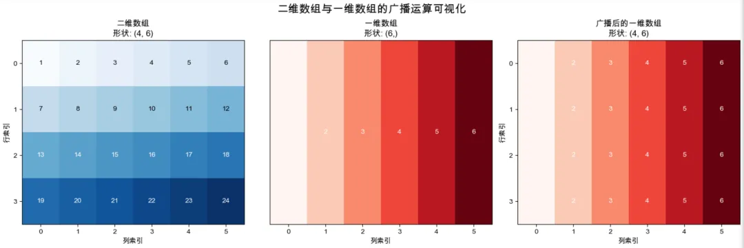 # 练习2.5:二维数组和一维数组的运算(图15.7)# 创建二维数组 (4,6)arr_2d = np.array([[1, 2, 3, 4, 5, 6],[7, 8, 9, 10, 11, 12],[13, 14, 15, 16, 17, 18],[19, 20, 21, 22, 23, 24]])# 创建一维数组 (6,)arr_1d_6 = np.array([1, 2, 3, 4, 5, 6])print("二维数组 (形状 {}):".format(arr_2d.shape))print(arr_2d)print("\n一维数组 (形状 {}):".format(arr_1d_6.shape))print(arr_1d_6)print()# 实现二维数组和一维数组的加法# 【思考:形状(4,6)和(6,)如何相加?广播原则如何应用?】broadcast_2d_1d = arr_1d_6 + arr_2d # 【提示:直接相加,注意广播方向】print("二维数组 + 一维数组 (广播加法):")print("结果形状:", broadcast_2d_1d.shape)print("结果:\n", broadcast_2d_1d)print()