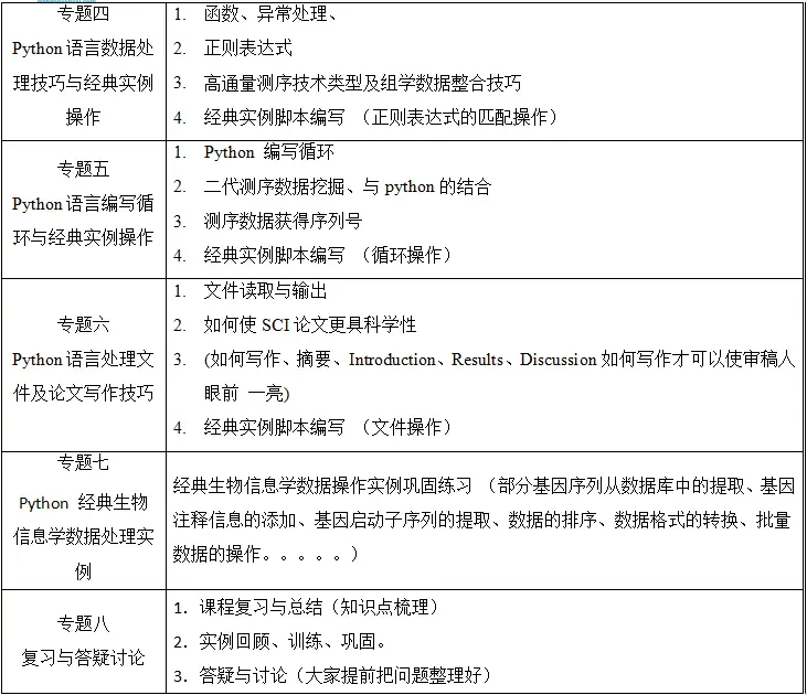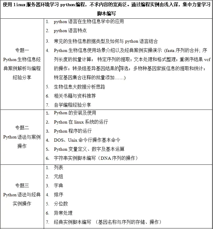 生物信息广泛涵盖基因组学、蛋白组学、系统生物学、表观遗传、非编码等前沿领域以及药物设 计、基因工程等应用领域。与传统的理论和实验学科不同,生物信息是一门数据科学,这就需要从业 者具备一定数据收集、管理、处理和分析的能力。在海量的组学数据面前,使用别人开发的软件及图 形界面操作往往不能解决工作中的问题,而简单的编程就可能解决问题,因而编程即成为一个生物信 息工作者的必备技能。本课程就是为生物信息初学者设计的编程研修班。选择 Python 作为生物信息的入门编程语言,是因为 Python 语言提供了从入门到高手的良好的学习曲线。Python 语言是至今为止最接近自然语言的编程语言,学过其它一些编程语言的学员甚至不 需要太多的训练就能读写其代码;模块化和面向对象的支持使得学员能不费力地从一个只能写几行代 码的操作员变成一个管理千行代码的程序员,同时书写良好可读性代码的编程习惯也会令其受益终 生;丰富的标准库和第三方包使得 Python 语言成为当前最好的“胶水语言”,把多方资源整合到一 起来解决工作中的问题。