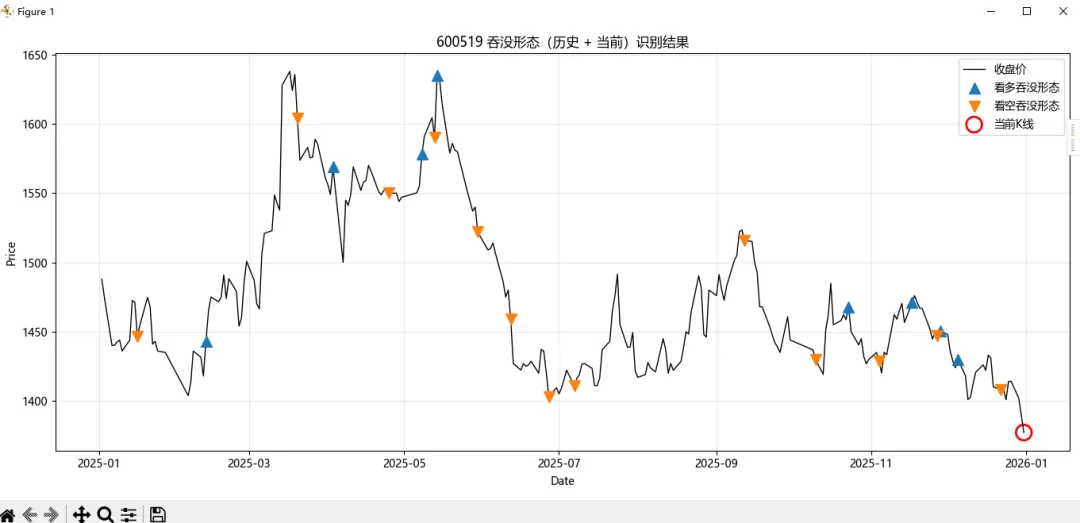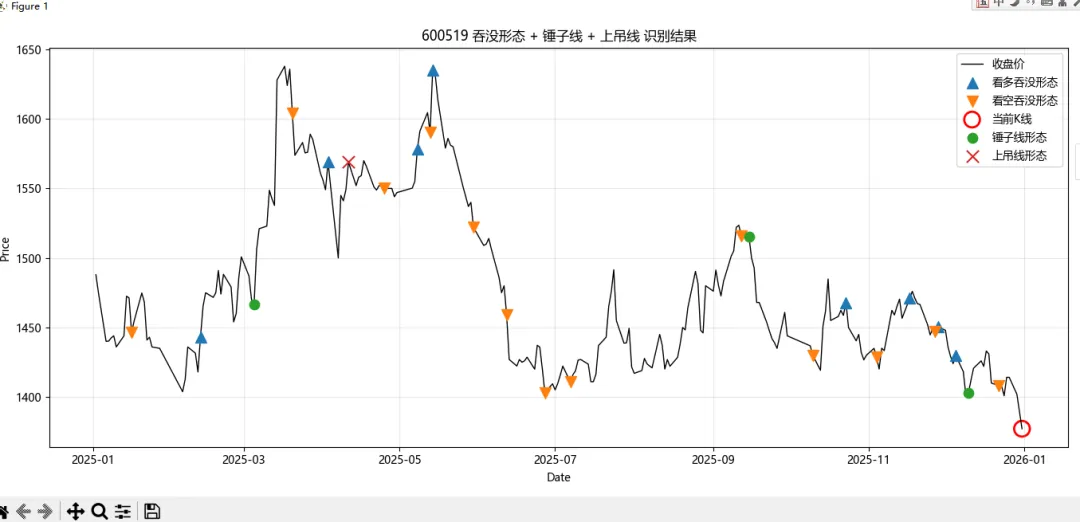 import talibimport pandas as pdimport matplotlib.pyplot as pltfrom sqlalchemy.orm import Sessionfrom datetime import datefrom db_stock import StockHistory, SessionLocal#解决中文乱码plt.rcParams["font.sans-serif"] = ["Microsoft YaHei"]plt.rcParams["axes.unicode_minus"] = False#从数据库中提取股票历史数据def get_stock_history( db: Session, stock_id: int, begin_date: date, end_date: date): records = ( db.query(StockHistory) .filter(StockHistory.stock_id == stock_id) .filter(StockHistory.date >= begin_date) .filter(StockHistory.date <= end_date) .order_by(StockHistory.date) .all() ) return records#把数据库记录转成DataFramedef records_to_dataframe(records): data = [] for r in records: data.append({ "date": r.date, "open": r.open_price, "high": r.high_price, "low": r.low_price, "close": r.close_price, "volume": r.volume }) df = pd.DataFrame(data) df.set_index("date", inplace=True) return df#创建数据库sessionsession = SessionLocal()#设置参数stock_id = 600519begin_date = date(2025, 1, 1)end_date = date(2025, 12, 31)#从数据库提取数据records = get_stock_history( session, stock_id, begin_date, end_date)#转成DataFrame处理df = records_to_dataframe(records)close = df["close"].valueshigh = df["high"].valueslow = df["low"].valuesopen = df["open"].valueslast_date = df.index[-1]last_price = df["close"].iloc[-1]engulfing = talib.CDLENGULFING(open, high, low, close)df["CDLENGULFING"] = engulfingbullish_idx = df["CDLENGULFING"] > 0 # 看多吞没bearish_idx = df["CDLENGULFING"] < 0 # 看空吞没hammer = talib.CDLHAMMER(open, high, low, close)df["CDLHAMMER"] = hammerhammer_idx = df["CDLHAMMER"] > 0 # 锤子线(偏多)hanging = talib.CDLHANGINGMAN(open, high, low, close)df["CDLHANGINGMAN"] = hanginghanging_idx = df["CDLHANGINGMAN"] < 0plt.figure(figsize=(14, 6))# ① 画价格plt.plot( df.index, df["close"], label="收盘价", color="black", linewidth=1)# ② 看多吞没(▲)plt.scatter( df.index[bullish_idx], df["close"][bullish_idx], marker="^", s=100, label="看多吞没形态", zorder=3)# ③ 看空吞没(▼)plt.scatter( df.index[bearish_idx], df["close"][bearish_idx], marker="v", s=100, label="看空吞没形态", zorder=3)# 当前K线plt.scatter( last_date, last_price, s=200, edgecolors="red", facecolors="none", linewidths=2, label="当前K线")# ④ 锤子线(●)plt.scatter( df.index[hammer_idx], df["close"][hammer_idx], marker="o", s=80, label="锤子线形态", zorder=3)# ⑤ 上吊线(×)plt.scatter( df.index[hanging_idx], df["close"][hanging_idx], marker="x", s=120, label="上吊线形态", zorder=3)plt.title(f"{stock_id} 吞没形态 + 锤子线 + 上吊线 识别结果")plt.xlabel("Date")plt.ylabel("Price")plt.legend()plt.grid(alpha=0.3)plt.tight_layout()plt.show(block=True)我们最后来总结下上面说到的形态,他们正解的解读方式: