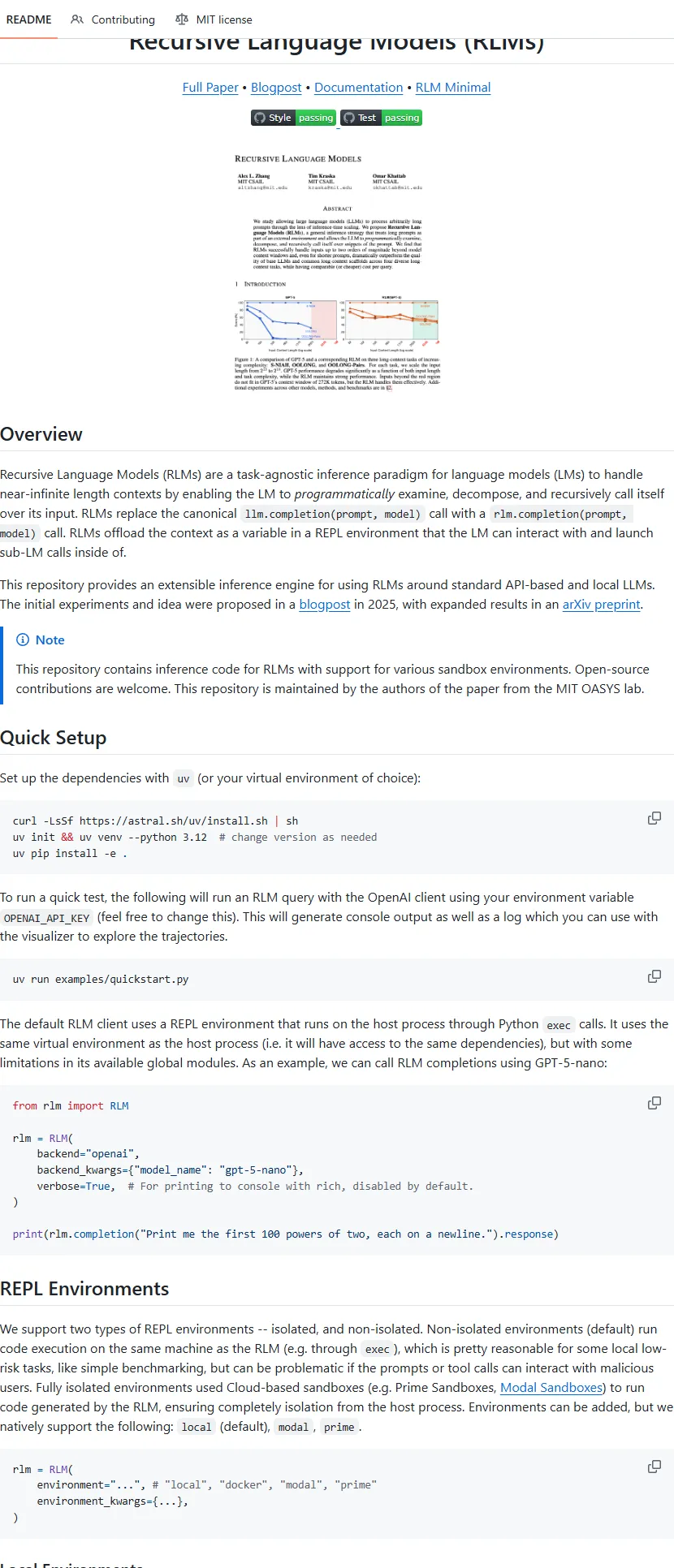 RLM将标准的llm.completion()封装为rlm.completion(),引入REPL(读取-求值-打印)环境作为运行沙箱。该环境支持本地(exec)、Docker及云隔离方案(如Modal Sandboxes),兼顾灵活性与安全性,允许模型在受控环境中执行代码并发起递归调用。