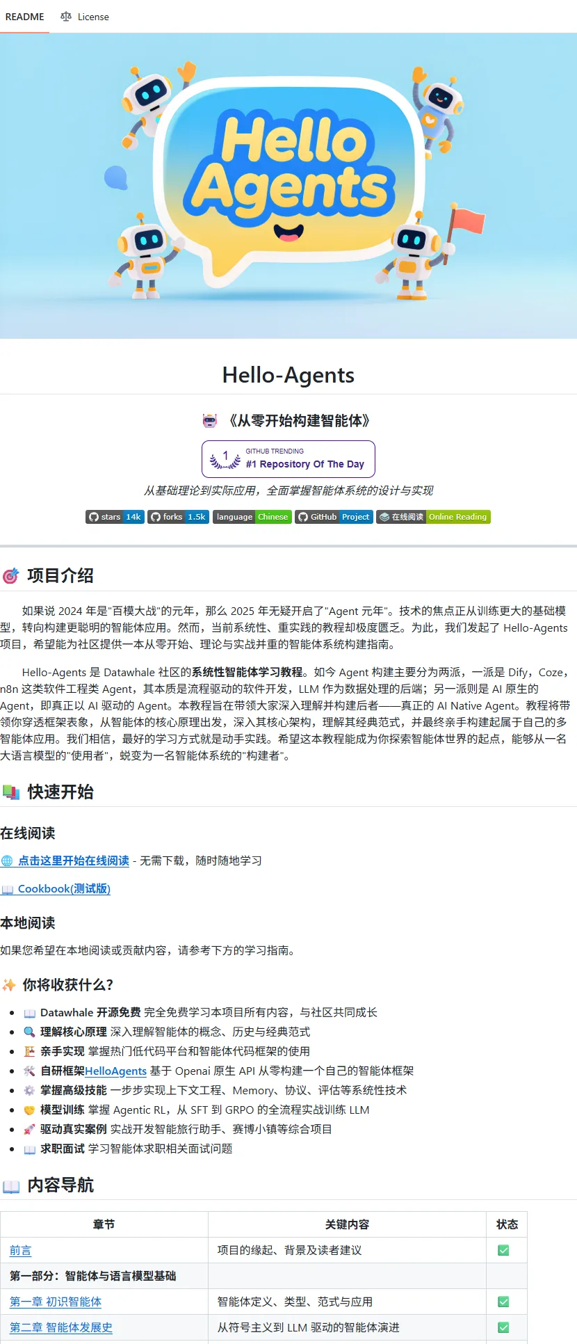 Hello-Agents 是 Datawhale 社区发起的开源智能体系统学习项目,定位为“从零开始构建 AI Native 智能体”的实践型教程。它不聚焦于低代码平台的流程编排,而是深入智能体的核心原理与原生架构,强调以大语言模型为认知引擎的自主推理、规划与协作能力。