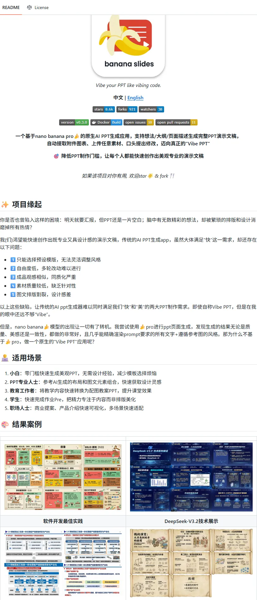 banana-slides 是一个基于 nano banana pro 🍌 模型的原生 AI PPT 生成工具,致力于实现真正“Vibe PPT”——即像写代码一样自然、高效、有风格地创作演示文稿。它突破传统AI PPT工具的模板依赖与同质化瓶颈,支持从一句话想法、结构化大纲或逐页描述出发,智能生成专业级幻灯片。