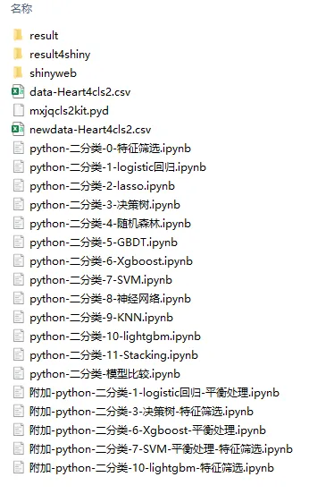 另提供特征筛选 案例代码(包括LASSO、SVM-RFE、Boruta等)、针对不平衡问题的平衡处理案例代码、制作机器学习shiny网页计算器的模板代码。