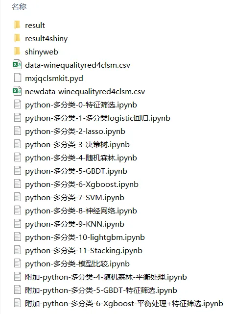 另提供特征筛选案例代码(包括LASSO、SVM-RFE、Boruta等)、针对不平衡问题的平衡处理案例代码、制作机器学习shiny网页计算器的模板代码。如下为所提供代码文件目录截图: