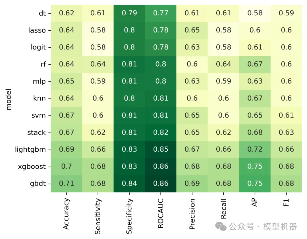 每个模型代码遵循的流程如下:数据读取、变量类型修正、描述性统计、相关性热图绘制、数据拆分、训练集测试集比较、数据预处理和模型设定、模型训练、模型预测评估、模型解释。