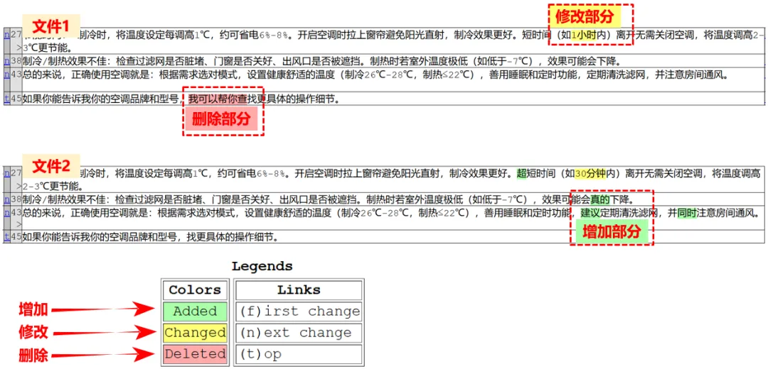 # 导入库from filediff.diff import file_diff_compare# 2个文件进行内容比对file_diff_compare("文件1.txt", "文件2.txt", diff_out="对比结果2.html")🟢 绿色高亮:新增的内容