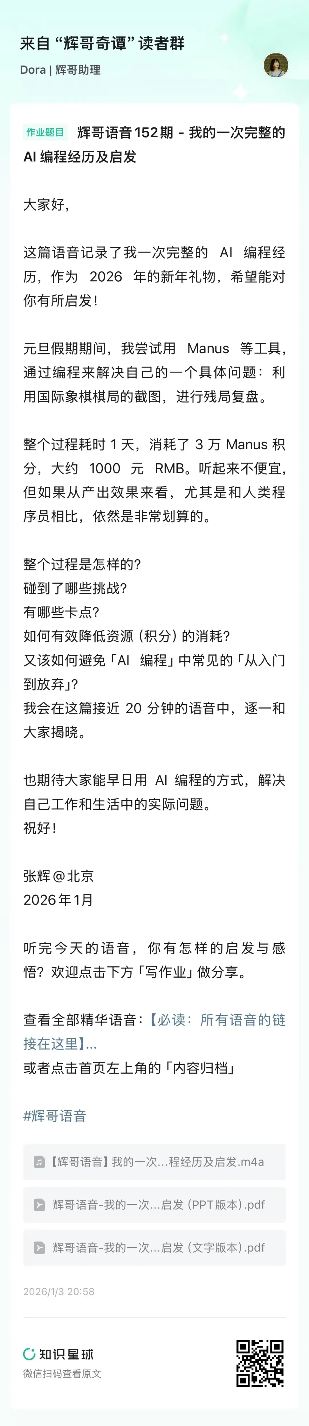 在这里,我正好有一个实际案例:我在元旦期间,用 AI 编程工具尝试解决「国际象棋残局复盘」的问题。目前 Web App 已基本可用。我把完整过程录制成了一篇18 分钟的语音,希望能给诸位打开一扇新的窗户。大家感兴趣可以扫描下方二维码来收听语音内容。