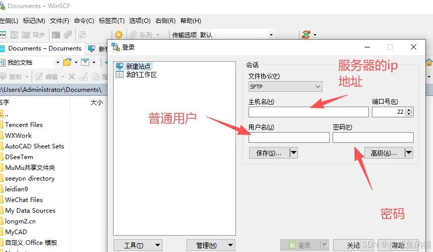 - 打开WinSCP,弹出“登录”对话框,按要求填写参数: