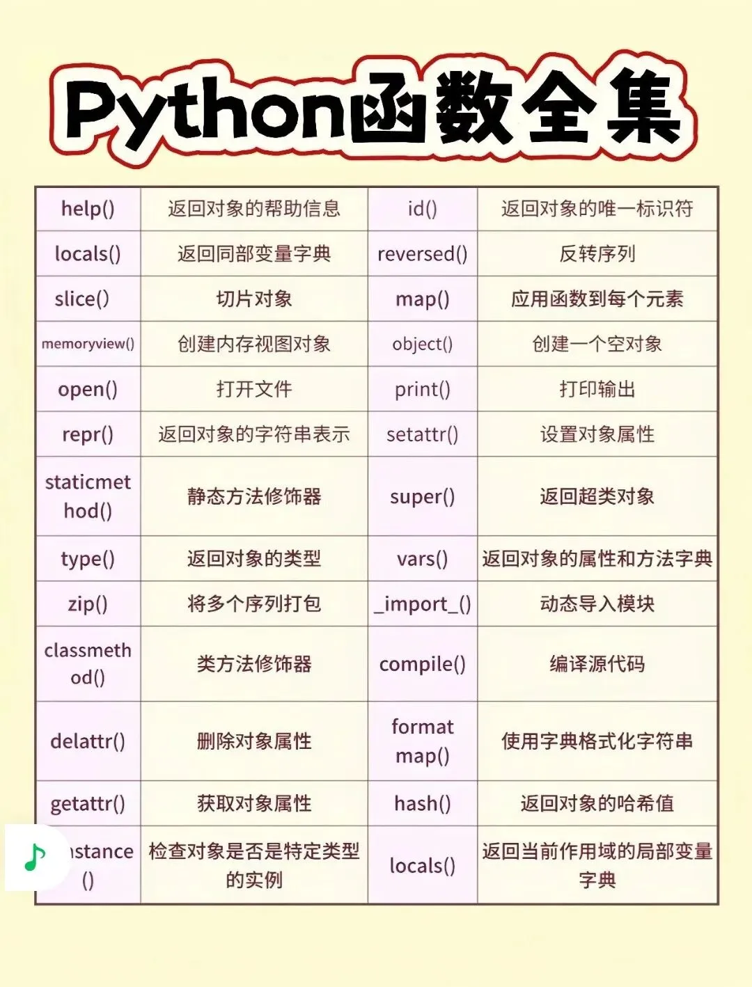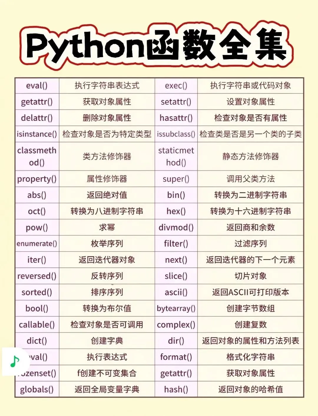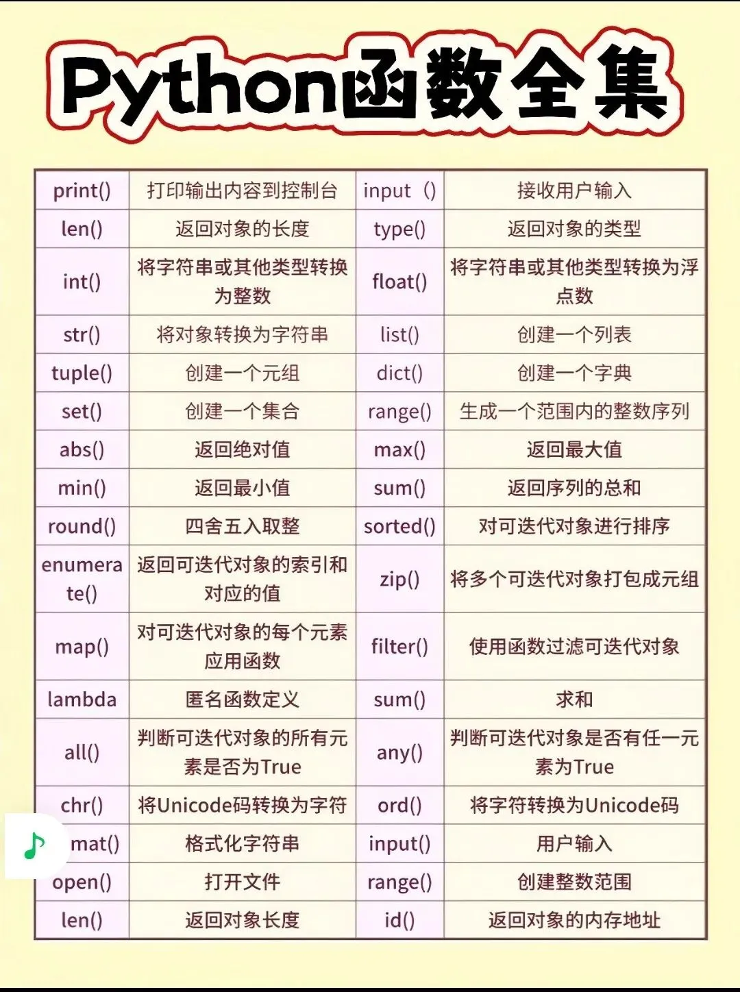 如果你需要查询某个具体模块(如 math 模块中的 sin, cos 或 os 模块中的文件操作函数),建议查阅 Python 官方文档,那里有最完整、最权威的函数索引。