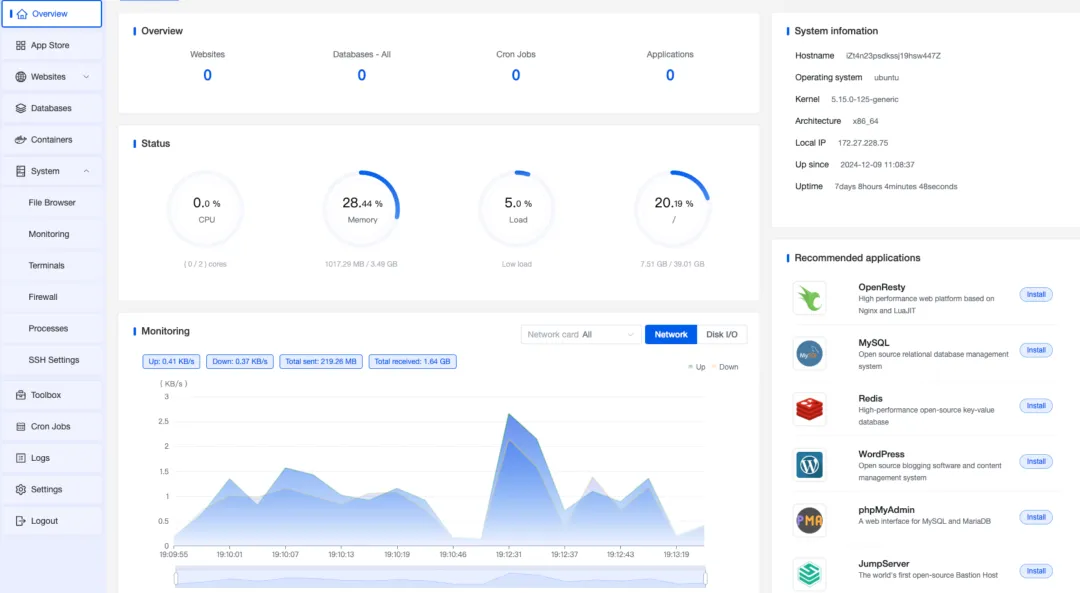 - 集成防火墙规则管理、日志审计和漏洞扫描,支持 WAF 增强和网站防篡改(Pro 版)。