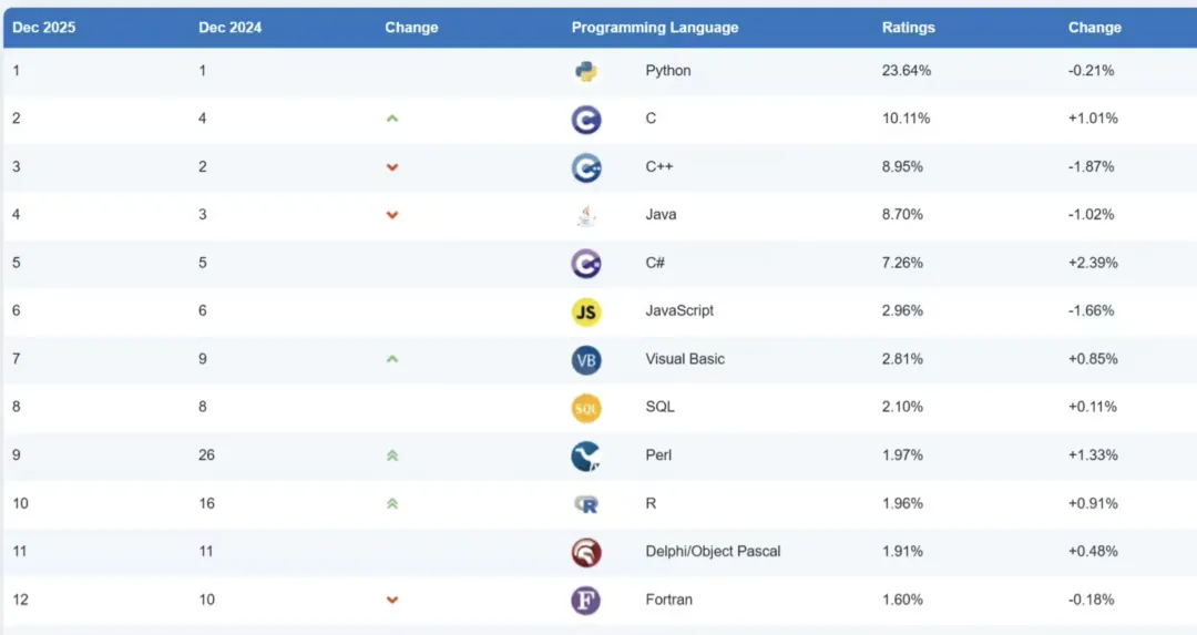 Python的统治力,在数据上体现得淋漓尽致。其市场占有率从2020年的8.5%一路攀升至2025年的24.45%,不仅连续多年位居TIOBE和PYPL等权威榜单首位,更在2024年首次超越JavaScript,成为GitHub上最受欢迎的编程语言。