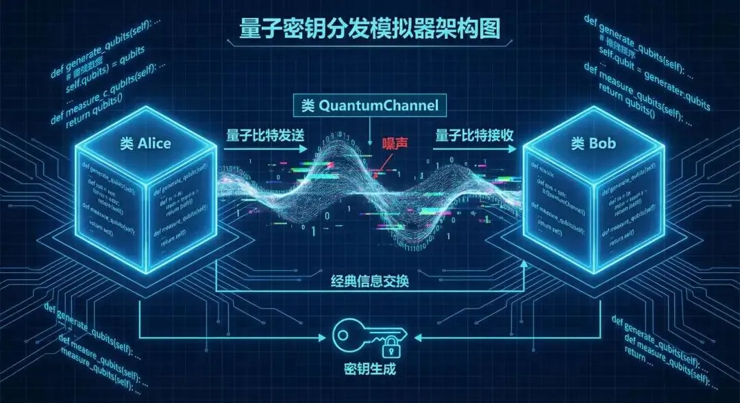 今天,我们将编写一套 QKD 仿真器。 我们将不再写几行简单的脚本,而是采用 面向对象 (OOP) 的正规工程思维,构建 Alice、Bob 和 Quantum Channel 三个核心类。