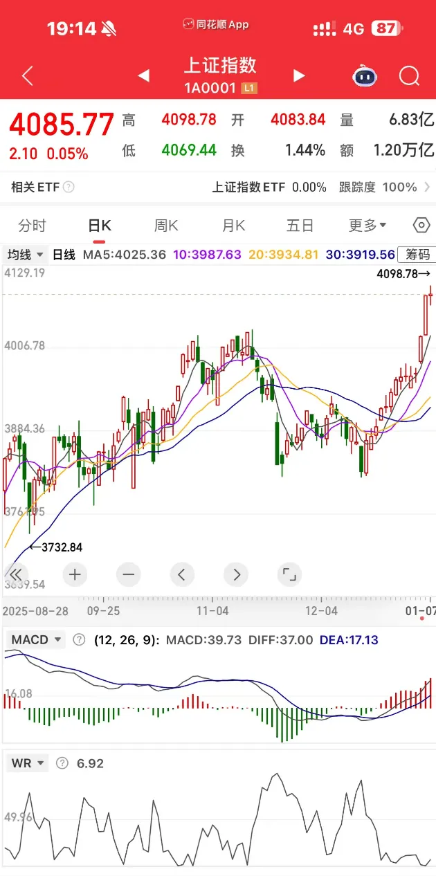 指数14连阳,昨天刚统计完13连阳,今天开盘4083.84,收盘4085.77又是阳线。