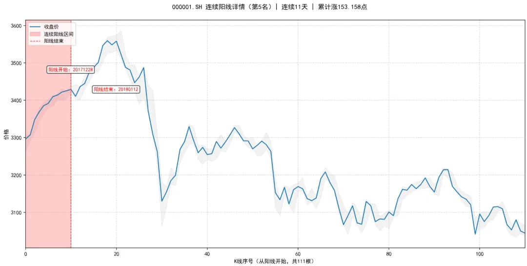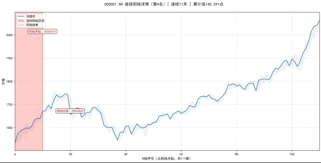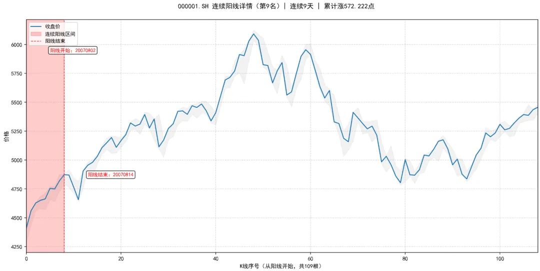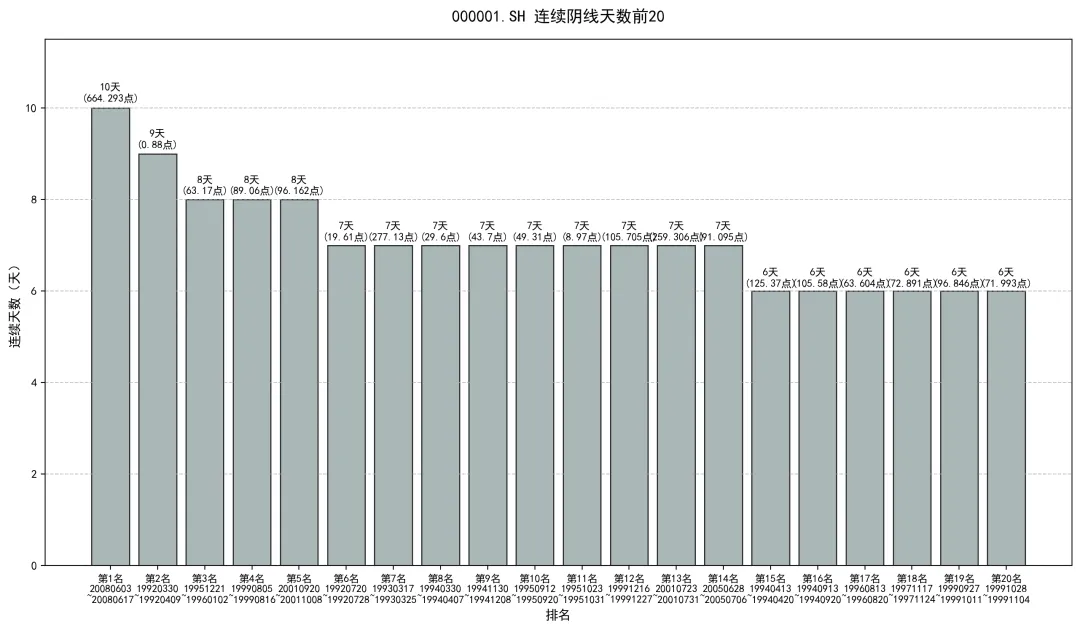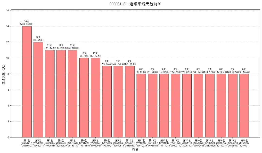 【连续阳线统计(前20)】1. 连续阳线天数排名(前20): 最长连续天数:14 天(20251217 ~ 20260107),累计上涨 260.961 点 次长连续天数:12 天(19920225 ~ 19920311),累计上涨 15.64 点 前20大连续阳线天数区间详情: 第1名:14 天 | 时间:20251217 ~ 20260107 | 累计上涨:260.961 点 | 日均上涨:18.6401 点 第2名:12 天 | 时间:19920225 ~ 19920311 | 累计上涨:15.64 点 | 日均上涨:1.3033 点 第3名:11 天 | 时间:19920505 ~ 19920519 | 累计上涨:144.49 点 | 日均上涨:13.1355 点 第4名:11 天 | 时间:20060615 ~ 20060629 | 累计上涨:140.291 点 | 日均上涨:12.7537 点 第5名:11 天 | 时间:20171228 ~ 20180112 | 累计上涨:153.158 点 | 日均上涨:13.9235 点 第6名:10 天 | 时间:19901227 ~ 19910110 | 累计上涨:8.7 点 | 日均上涨:0.87 点 第7名:10 天 | 时间:19910827 ~ 19910909 | 累计上涨:17.73 点 | 日均上涨:1.773 点 第8名:9 天 | 时间:19970820 ~ 19970901 | 累计上涨:96.96 点 | 日均上涨:10.7733 点 第9名:9 天 | 时间:20070802 ~ 20070814 | 累计上涨:572.222 点 | 日均上涨:63.5802 点 第10名:9 天 | 时间:20150311 ~ 20150323 | 累计上涨:401.66 点 | 日均上涨:44.6289 点 第11名:8 天 | 时间:19910219 ~ 19910228 | 累计上涨:0.48 点 | 日均上涨:0.06 点 第12名:8 天 | 时间:19910807 ~ 19910816 | 累计上涨:11.98 点 | 日均上涨:1.4975 点 第13名:8 天 | 时间:19911009 ~ 19911018 | 累计上涨:15.02 点 | 日均上涨:1.8775 点 第14名:8 天 | 时间:19991228 ~ 20000110 | 累计上涨:199.76 点 | 日均上涨:24.97 点 第15名:8 天 | 时间:20061114 ~ 20061123 | 累计上涨:198.598 点 | 日均上涨:24.8247 点 第16名:8 天 | 时间:20070323 ~ 20070403 | 累计上涨:220.074 点 | 日均上涨:27.5092 点 第17名:8 天 | 时间:20130128 ~ 20130206 | 累计上涨:143.173 点 | 日均上涨:17.8966 点 第18名:8 天 | 时间:20140722 ~ 20140731 | 累计上涨:147.083 点 | 日均上涨:18.3854 点 第19名:8 天 | 时间:20150518 ~ 20150527 | 累计上涨:633.022 点 | 日均上涨:79.1277 点 第20名:8 天 | 时间:20191202 ~ 20191211 | 累计上涨:52.436 点 | 日均上涨:6.5545 点2. 连续阳线上涨点数排名(前20): 最大上涨点数:804.58 点(连续 3 天,19920521 ~ 19920525) 次大上涨点数:633.022 点(连续 8 天,20150518 ~ 20150527) 前20大连续阳线上涨点数区间详情: 第1名:804.58 点 | 连续天数:3 天 | 时间:19920521 ~ 19920525 | 日均上涨:268.1933 点 第2名:633.022 点 | 连续天数:8 天 | 时间:20150518 ~ 20150527 | 日均上涨:79.1277 点 第3名:574.71 点 | 连续天数:6 天 | 时间:20070927 ~ 20071011 | 日均上涨:95.785 点 第4名:572.222 点 | 连续天数:9 天 | 时间:20070802 ~ 20070814 | 日均上涨:63.5802 点 第5名:538.115 点 | 连续天数:7 天 | 时间:20070820 ~ 20070828 | 日均上涨:76.8736 点 第6名:466.051 点 | 连续天数:3 天 | 时间:20080422 ~ 20080424 | 日均上涨:155.3503 点 第7名:440.191 点 | 连续天数:3 天 | 时间:20240926 ~ 20240930 | 日均上涨:146.7303 点 第8名:401.66 点 | 连续天数:9 天 | 时间:20150311 ~ 20150323 | 日均上涨:44.6289 点 第9名:400.163 点 | 连续天数:5 天 | 时间:20070607 ~ 20070613 | 日均上涨:80.0326 点 第10名:398.088 点 | 连续天数:4 天 | 时间:20071219 ~ 20071224 | 日均上涨:99.522 点 第11名:371.364 点 | 连续天数:5 天 | 时间:20200630 ~ 20200706 | 日均上涨:74.2728 点 第12名:351.403 点 | 连续天数:1 天 | 时间:20080204 ~ 20080204 | 日均上涨:351.403 点 第13名:340.103 点 | 连续天数:5 天 | 时间:20141202 ~ 20141208 | 日均上涨:68.0206 点 第14名:334.799 点 | 连续天数:3 天 | 时间:20071026 ~ 20071030 | 日均上涨:111.5997 点 第15名:333.554 点 | 连续天数:6 天 | 时间:20151104 ~ 20151111 | 日均上涨:55.5923 点 第16名:332.536 点 | 连续天数:6 天 | 时间:20061222 ~ 20061229 | 日均上涨:55.4227 点 第17名:318.22 点 | 连续天数:6 天 | 时间:20150716 ~ 20150723 | 日均上涨:53.0367 点 第18名:310.318 点 | 连续天数:5 天 | 时间:20150421 ~ 20150427 | 日均上涨:62.0636 点 第19名:307.424 点 | 连续天数:4 天 | 时间:20070912 ~ 20070917 | 日均上涨:76.856 点 第20名:302.696 点 | 连续天数:8 天 | 时间:20240206 ~ 20240223 | 日均上涨:37.837 点【连续阴线统计(前20)】1. 连续阴线天数排名(前20): 最长连续天数:10 天(20080603 ~ 20080617),累计下跌 664.293 点 次长连续天数:9 天(19920330 ~ 19920409),累计下跌 0.88 点 前20大连续阴线天数区间详情: 第1名:10 天 | 时间:20080603 ~ 20080617 | 累计下跌:664.293 点 | 日均下跌:66.4293 点 第2名:9 天 | 时间:19920330 ~ 19920409 | 累计下跌:0.88 点 | 日均下跌:0.0978 点 第3名:8 天 | 时间:19951221 ~ 19960102 | 累计下跌:63.17 点 | 日均下跌:7.8962 点 第4名:8 天 | 时间:19990805 ~ 19990816 | 累计下跌:89.06 点 | 日均下跌:11.1325 点 第5名:8 天 | 时间:20010920 ~ 20011008 | 累计下跌:96.162 点 | 日均下跌:12.0203 点 第6名:7 天 | 时间:19920720 ~ 19920728 | 累计下跌:19.61 点 | 日均下跌:2.8014 点 第7名:7 天 | 时间:19930317 ~ 19930325 | 累计下跌:277.13 点 | 日均下跌:39.59 点 第8名:7 天 | 时间:19940330 ~ 19940407 | 累计下跌:29.6 点 | 日均下跌:4.2286 点 第9名:7 天 | 时间:19941130 ~ 19941208 | 累计下跌:43.7 点 | 日均下跌:6.2429 点 第10名:7 天 | 时间:19950912 ~ 19950920 | 累计下跌:49.31 点 | 日均下跌:7.0443 点 第11名:7 天 | 时间:19951023 ~ 19951031 | 累计下跌:8.97 点 | 日均下跌:1.2814 点 第12名:7 天 | 时间:19991216 ~ 19991227 | 累计下跌:105.705 点 | 日均下跌:15.1007 点 第13名:7 天 | 时间:20010723 ~ 20010731 | 累计下跌:259.306 点 | 日均下跌:37.0437 点 第14名:7 天 | 时间:20050628 ~ 20050706 | 累计下跌:91.095 点 | 日均下跌:13.0136 点 第15名:6 天 | 时间:19940413 ~ 19940420 | 累计下跌:125.37 点 | 日均下跌:20