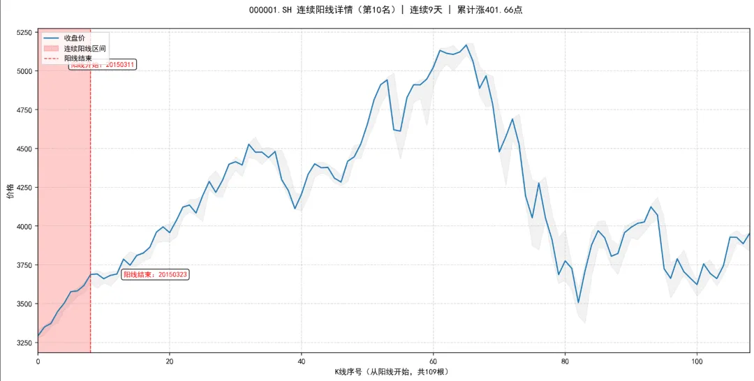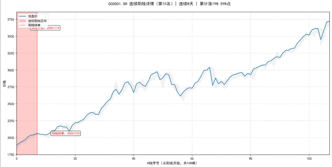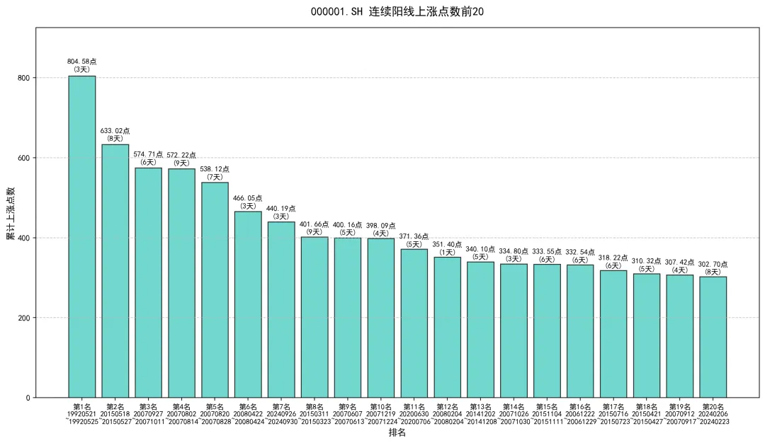 写个python脚本统计下历史的长阳,连续上涨的各时间区间排名,顺便看一下后续的表现。