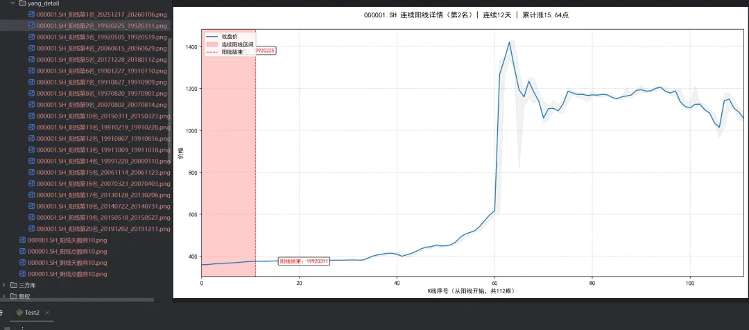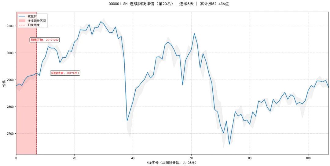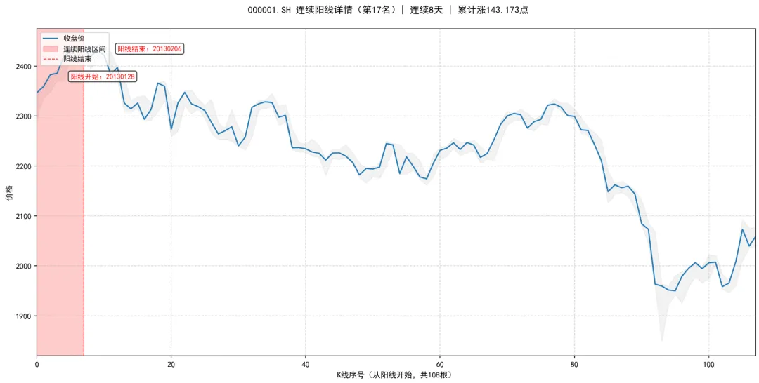 import pandas as pdimport numpy as npimport matplotlib.pyplot as pltimport osimport warnings# 忽略无关警告warnings.filterwarnings('ignore')# 设置中文字体,避免乱码plt.rcParams['font.sans-serif'] = ['SimHei'] # 黑体plt.rcParams['axes.unicode_minus'] = False# 正常显示负号# 优化绘图性能plt.rcParams['agg.path.chunksize'] = 10000defload_stock_data(file_path: str) -> tuple[pd.DataFrame, str]:""" 加载股票数据并进行预处理 返回处理后的DataFrame和股票代码 """# 读取CSV文件 df = pd.read_csv(file_path)# 数据预处理 df['trade_date'] = df['trade_date'].astype(str) # 日期转字符串 df = df.sort_values(by=['trade_date']).reset_index(drop=True) # 按日期排序# 确保核心字段为数值型for col in ['close', 'open', 'high', 'low', 'change']: df[col] = pd.to_numeric(df[col], errors='coerce')# 成交量字段兼容(如果存在)if'vol'notin df.columns: df['vol'] = 0# 无成交量时填充0# 从文件名提取股票代码 stock_code = file_path.split('\\')[-1].split('_')[0] df['stock_code'] = stock_code# 添加K线序号列(便于定位区间) df['k_index'] = range(len(df))return df, stock_codedefanalyze_consecutive_candlestick(df: pd.DataFrame, stock_code: str) -> tuple[dict, pd.DataFrame]:""" 分析连续阳线/阴线趋势(阳线=收盘>开盘,阴线=收盘<开盘) 返回统计结果和带区间标记的完整DataFrame """# 标记K线类型:1=阳线(收盘>开盘),-1=阴线(收盘<开盘),0=平盘(收盘=开盘) df['candlestick'] = np.where(df['close'] > df['open'], 1, np.where(df['close'] < df['open'], -1, 0))# 识别连续阳/阴线区间 candle_intervals = [] current_candle = None start_idx = 0for idx inrange(len(df)): candle_type = df.iloc[idx]['candlestick']# 跳平平盘,结束当前连续区间if candle_type == 0:if current_candle isnotNone: end_idx = idx - 1# 计算该区间的累计涨跌 total_change = round(df.iloc[start_idx:end_idx + 1]['change'].sum(), 4) avg_daily_change = round(df.iloc[start_idx:end_idx + 1]['change'].mean(), 4)# 记录区间详细信息(包含K线索引) candle_intervals.append({'stock_code': stock_code,'candle_type': '阳线'if current_candle == 1else'阴线','start_date': df.iloc[start_idx]['trade_date'],'end_date': df.iloc[end_idx]['trade_date'],'start_k_index': df.iloc[start_idx]['k_index'],'end_k_index': df.iloc[end_idx]['k_index'],'consecutive_days': end_idx - start_idx + 1,'total_change': total_change,'avg_daily_change': avg_daily_change }) current_candle = Nonecontinue# K线类型变化,结束上一个区间,开始新区间if candle_type != current_candle:if current_candle isnotNone: end_idx = idx - 1 total_change = round(df.iloc[start_idx:end_idx + 1]['change'].sum(), 4) avg_daily_change = round(df.iloc[start_idx:end_idx + 1]['change'].mean(), 4) candle_intervals.append({'stock_code': stock_code,'candle_type': '阳线'if current_candle == 1else'阴线','start_date': df.iloc[start_idx]['trade_date'],'end_date': df.iloc[end_idx]['trade_date'],'start_k_index': df.iloc[start_idx]['k_index'],'end_k_index': df.iloc[end_idx]['k_index'],'consecutive_days': end_idx - start_idx + 1,'total_change': total_change,'avg_daily_change': avg_daily_change }) current_candle = candle_type start_idx = idx# 处理最后一个未结束的区间if current_candle isnotNone: end_idx = len(df) - 1 total_change = round(df.iloc[start_idx:end_idx + 1]['change'].sum(), 4) avg_daily_change = round(df.iloc[start_idx:end_idx + 1]['change'].mean(), 4) candle_intervals.append({'stock_code': stock_code,'candle_type': '阳线'if current_candle == 1else'阴线','start_date': df.iloc[start_idx]['trade_date'],'end_date': df.iloc[end_idx]['trade_date'],'start_k_index': df.iloc[start_idx]['k_index'],'end_k_index': df.iloc[end_idx]['k_index'],'consecutive_days': end_idx - start_idx + 1,'total_change': total_change,'avg_daily_change': avg_daily_change })# 分离阳线和阴线区间(取前20) yang_intervals = [x for x in candle_intervals if x['candle_type'] == '阳线'] yin_intervals = [x for x in candle_intervals if x['candle_type'] == '阴线']# 按连续天数降序排序(取前20) yang_by_days = sorted(yang_intervals, key=lambda x: x['consecutive_days'], reverse=True)[:20] yin_by_days = sorted(yin_intervals, key=lambda x: x['consecutive_days'], reverse=True)[:20]# 按总涨跌点数排序(阳线正序,阴线负序,取前20) yang_by_points = sorted(yang_intervals, key=lambda x: x['total_change'], reverse=True)[:20] yin_by_points = sorted(yin_intervals, key=lambda x: x['total_change'])[:20] # 阴线跌幅越大排越前 results = {'yang': {'by_days': yang_by_days, 'by_points': yang_by_points}, # 阳线'yin': {'by_days': yin_by_days, 'by_points': yin_by_points} # 阴线 }return results, dfdefprint_detailed_results(results: dict, stock_code: str):""" 打印详细的连续阳/阴线统计结果(前20,天数和点数互显) """print(f"\n{'=' * 70}")print(f"股票代码 {stock_code} 连续阳/阴线统计分析(前20名)")print(f"{'=' * 70}")# 连续阳线分析print("\n【连续阳线统计(前20)】") yang_days = results['yang']['by_days'] yang_points = results['yang']['by_points']if yang_days:# 天数统计(前20,同时显示点数)print("\n1. 连续阳线天数排名(前20):")print(f" 最长连续天数:{yang_days[0]['consecutive_days']} 天({yang_days[0]['start_date']} ~ {yang_days[0]['end_date']}),累计上涨 {yang_days[0]['total_change']} 点")iflen(yang_days) >= 2:print(f" 次长连续天数:{yang_days[1]['consecutive_days']} 天({yang_days[1]['start_date']} ~ {yang_days[1]['end_date']}),累计上涨 {yang_days[1]['total_change']} 点")print("\n 前20大连续阳线天数区间详情:")for i, interval inenumerate(yang_days, 1):print(f" 第{i}名:{interval['consecutive_days']} 天 | 时间:{interval['start_date']} ~ {interval['end_date']} | "f"累计上涨:{interval['total_change']} 点 | 日均上涨:{interval['avg_daily_change']} 点")# 点数统计(前20,同时显示天数)print("\n2. 连续阳线上涨点数排名(前20):")print(f" 