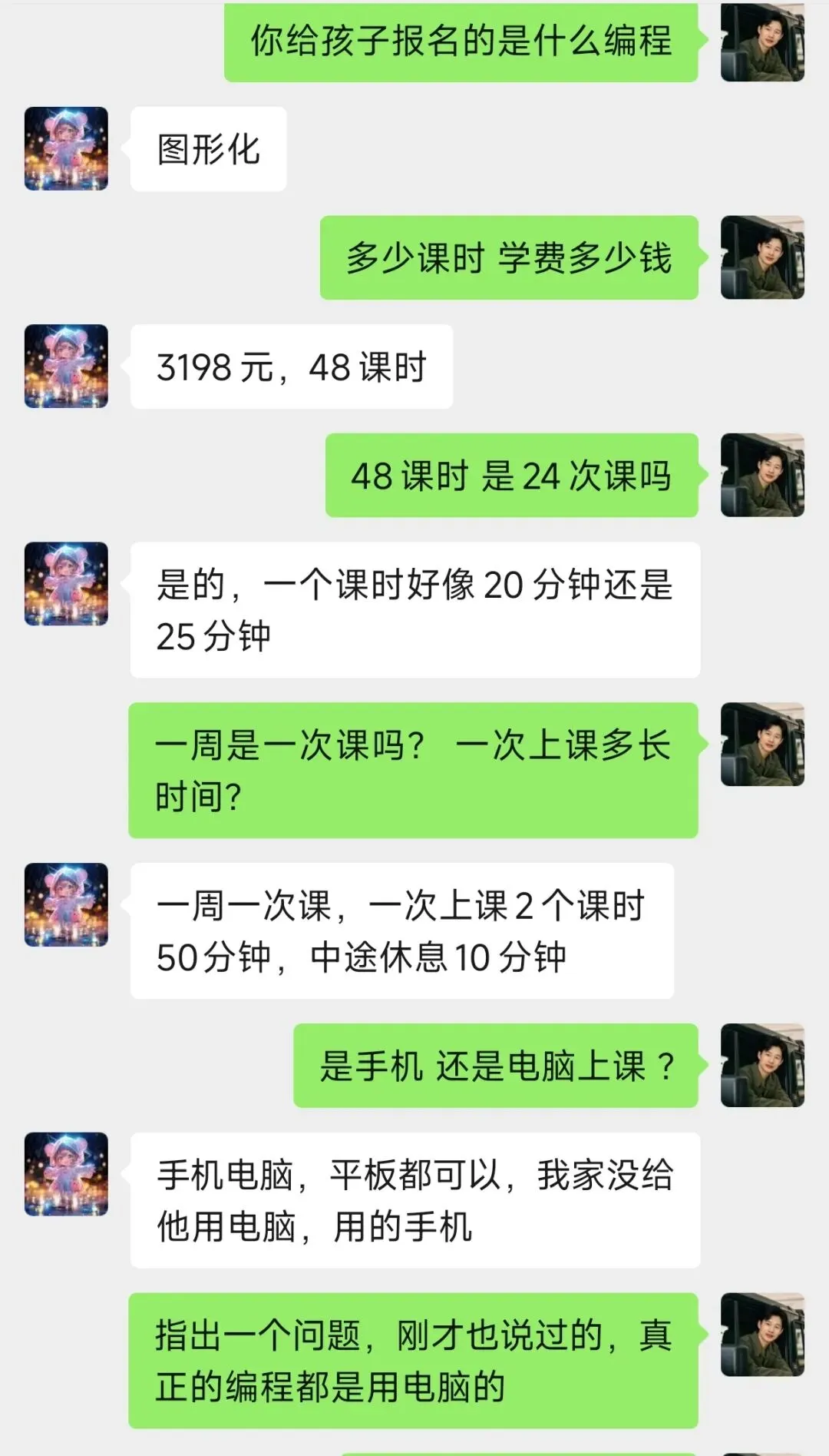 今天又一位家长被坑了,孩子一年级,妈妈刚给报了某个线上编程。居然让孩子用手机学编程,我真的从未听过,要知道真正的编程学习,都是用电脑的,除非是纯玩。这里做一个科普,先让孩子学编程锻炼逻辑思维能力,或者走科技特长生,必须用电脑。其次,我说为什么尽量不要去大机构学编程,不是说他们的课程不好,而是服务不行,再或者说下面的某些老师不行,为了完成业绩,各种吹嘘。结果课程到了孩子手里,就变样了。一个大的编程机构,怎么可能不知道不能用手机学编程?可是有些销售老师,偏偏说怎么都可以,真的是耽误孩子。在这里我想说一个常识,卖产品的大品牌和卖课程的大品牌不要放在一起比较,没什么可比性。实物产品,比如手机,电脑,空调等,我推荐选择大品牌。起码,我是这么做的。这些产品出厂必须经过国家相关检测,不合格是不能上市的。虚拟产品,我不推荐大品牌。尤其是课程类的,我推荐选择好老师。孩子最终是在跟老师学,不是跟品牌学。大的品牌的课程有可能是好的,可是经过一道道老师的介绍,后面真的会出现各种问题。尤其是遇到不专业的,又急需完成业绩的。我们常说,一步错,步步错。课程选择错了,后面不单单是浪费钱的问题,孩子学着不对应的课程,浪费孩子的时间,才是最大的坑。为什么家长一再出现这样的问题,不是家长的错,更不是孩子的错?当时市场出现非常混乱的销售模式时,家长要避坑就需要咨询相关专业人士,否则真的会得不偿失。实物产品用坏了,扔了就行了。虚拟的课程,尤其是不好的课程,让孩子学习,就是耽误孩子的时间。第二,1-4年级,孩子不是天赋型选手,首选图形编程第四,家长有时间的话,尽量陪着孩子一起学。图形编程就是中文编程,高中及以上学历完全不在话下。家长问,为什么小孩子都喜欢ht编程?城市套路深