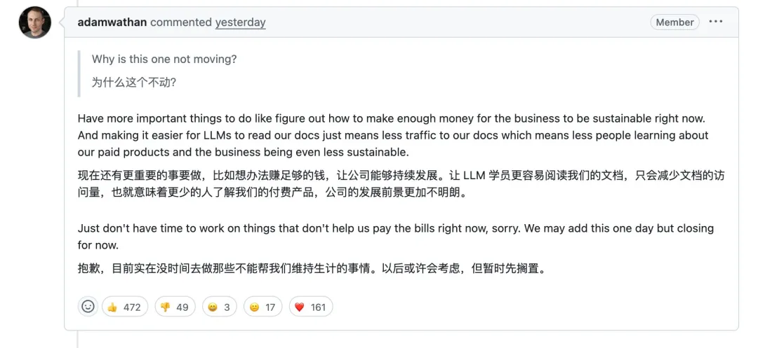 AI编程现在已经非常强大了,很多不会的、记不住的API,问AI或者直接让AI去写就行了,这就意味着程序员自行阅读、学习官方文档的时间被大大缩减,而开源项目的官方文档,又是一个重要的变现引流渠道,首当其冲,开源项目的生机越来越难了,就连顶级的前端开源项目 Tailwindcss 也无法幸免~