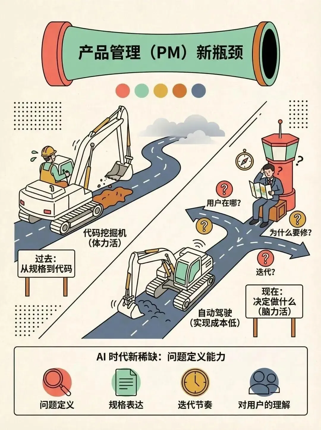 我们可以用一个形象的比喻来理解这种变化:过去做产品就像“修路”,工程师是开挖掘机的;现在挖掘机突然变成了“自动驾驶”,甚至效率极高,那么核心问题就变成了:这条路到底要修到哪里?为什么要修?用户在哪里?要不要收费?以及如何迭代?