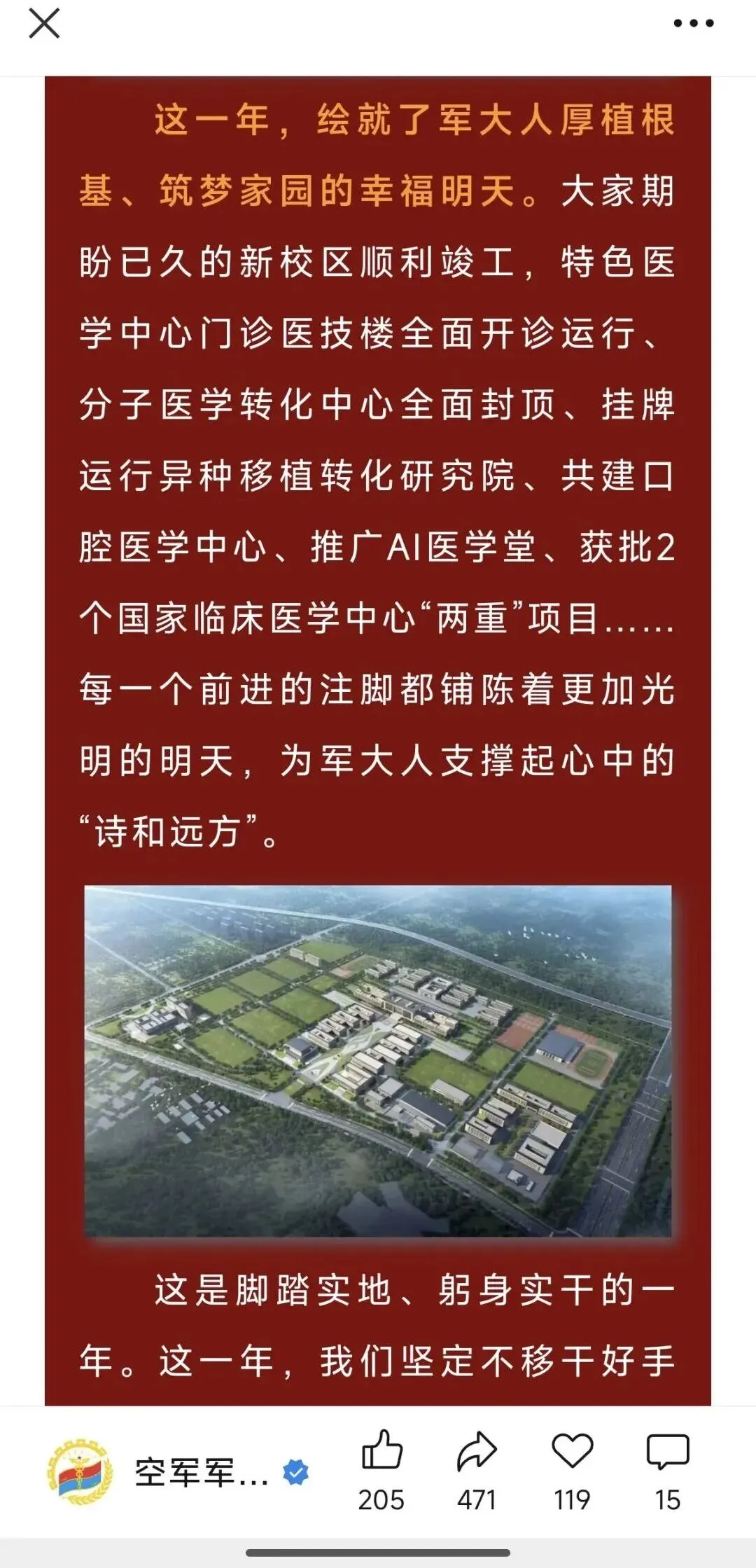 二零二六年元旦,空军军医大学官方微信公众号发布的新年献词中,悄然透露了一条令西安教育界瞩目的消息:“大家期盼已久的新校区顺利竣工”。