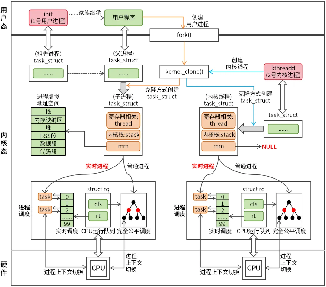 Linux进程有两个重要的概念:task_struct结构和进程调度。 在Linux系统中,无论是进程还是线程,在内核中都统一被称为任务(task),task通过task_struct进行管理,task_struct定义在include/linux/sched.h头文件中,其定义如下: