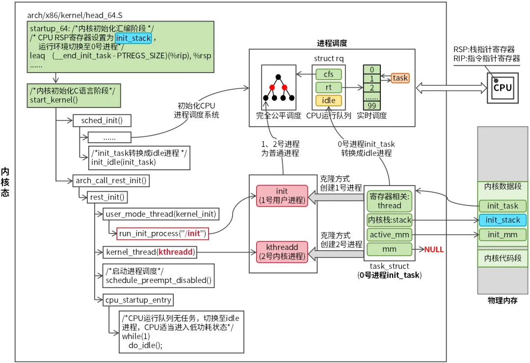 如果把Linux内核比作一个公司,0号进程就是公司的创始人。0号进程需要完成内核框架的搭建,让后续子孙进程有一个可靠的环境运行。内核刚启动时,CPU执行内核初始化代码,此时0号进程还躺在内核数据段,当CPU执行一条设置栈指针寄存器的指令时(即将RSP设置为init_stack,init_stack为0号进程内核栈,全局变量,在编译阶段被定义),0号进程被激活,CPU运行环境切换至0号进程。