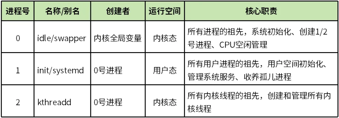 内核初始化末期,0号进程会创建1号进程和2号进程,三者对比见表1。