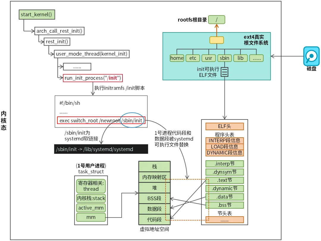 root@raspberrypi:/# ls -l /sbin/initlrwxrwxrwx 1 root root 20 Dec 12024 /sbin/init -> /lib/systemd/systemd当然我们可以将/sbin/init链接到不同的用户程序,来自定义1号进程。switch_root命令底层依赖execve系统调用,execve将为1号进程创建一个新的用户态虚拟地址空间(mm),然后将通过文件映射方式将systemd(ELF可执行文件)中的数据段和代码段映射至mm,kernel_init内核线程就转换成用户态systemd进程了。