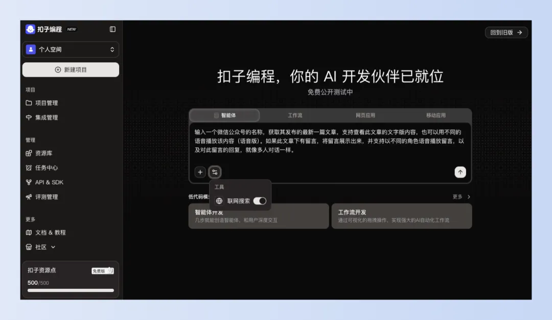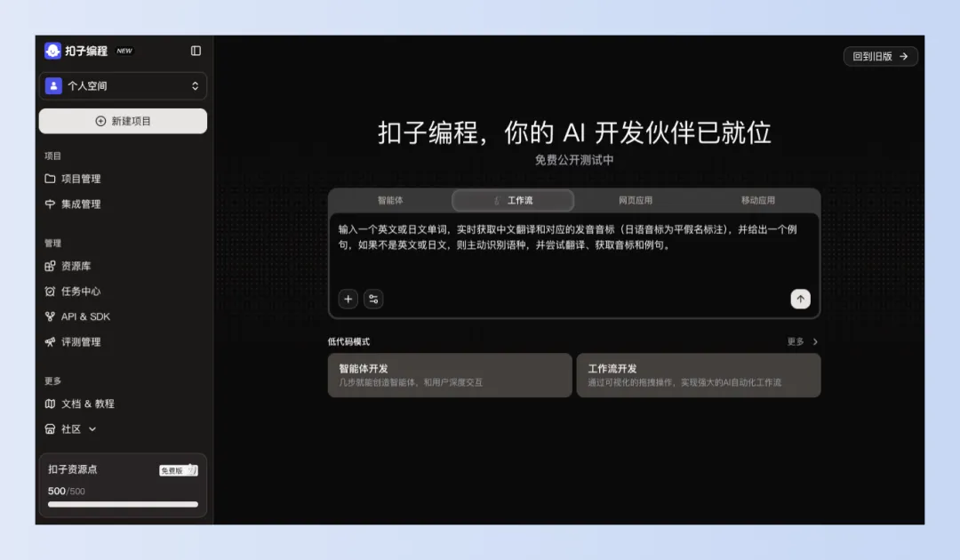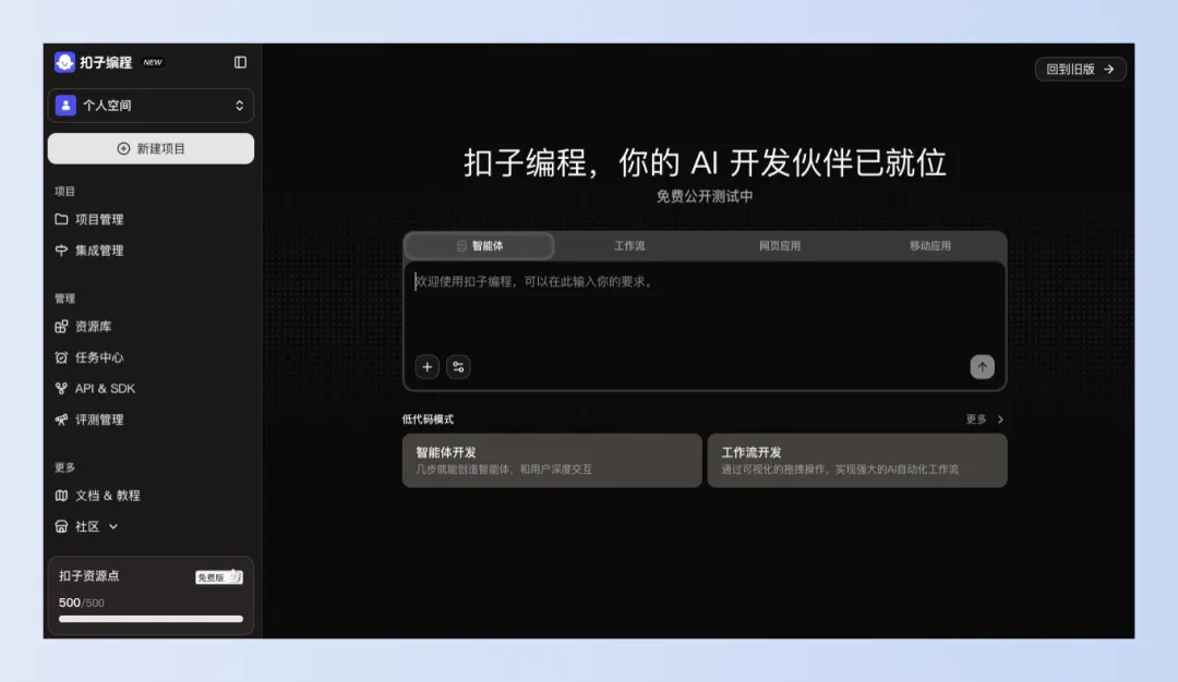 现今AI大模型如此盛行、vibe coding 工具你追我赶的,这不扣子也与时俱进推出了扣子编程,让你一句话便可以生成一个智能体、工作流、网页应用,甚至是移动应用。