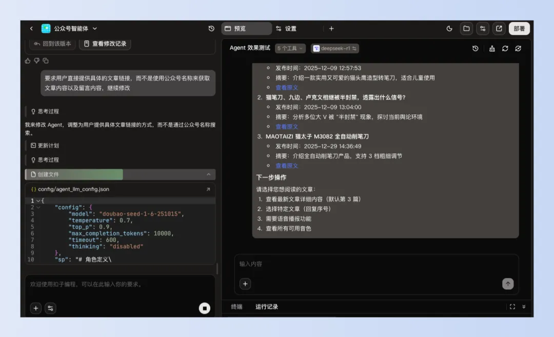 不到一杯茶的功夫,它就给我干完了↑。如果对大模型不满意,还可以切换其他大模型,比如DeepSeek