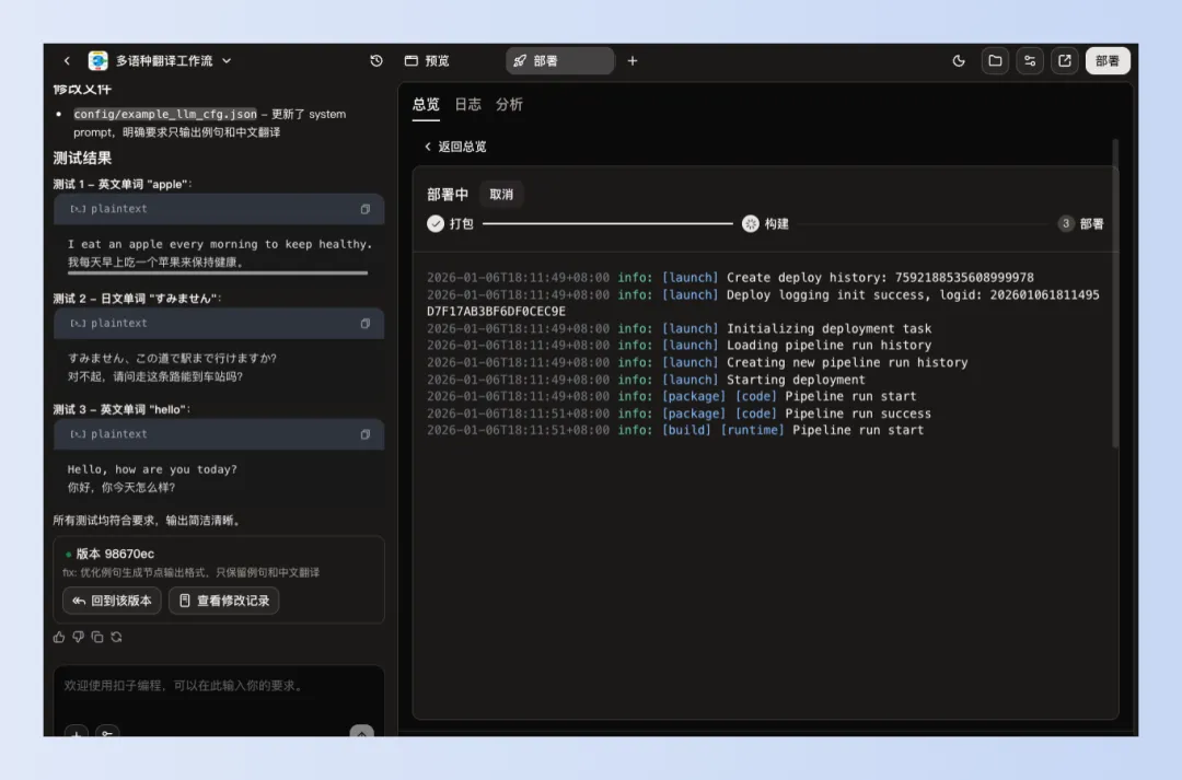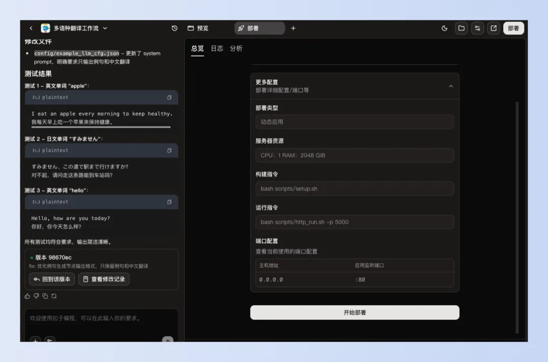 我还是整一个简单一点的吧,就拿简单的翻译功能来试试:"输入一个英文或日文单词,实时获取中文翻译和对应的发音音标(日语音标为平假名标注),并给出一个例句"。