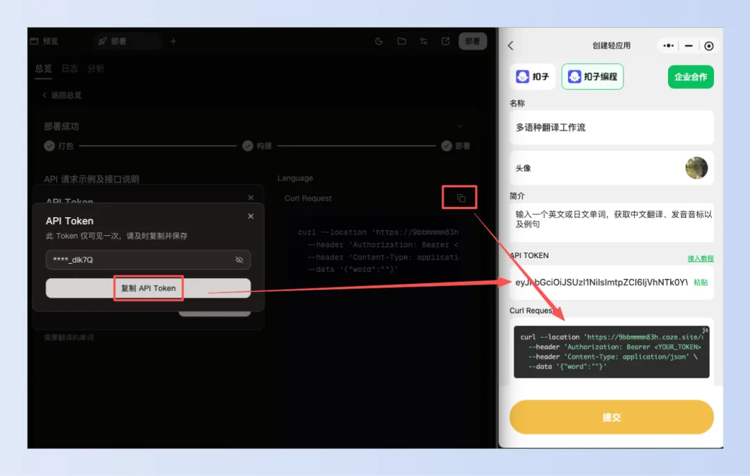 然后将 API Token 和 Curl Request 分别复制,填写到小微智能体发布智能体或轻应用时对应的位置,最后提交发布即可。