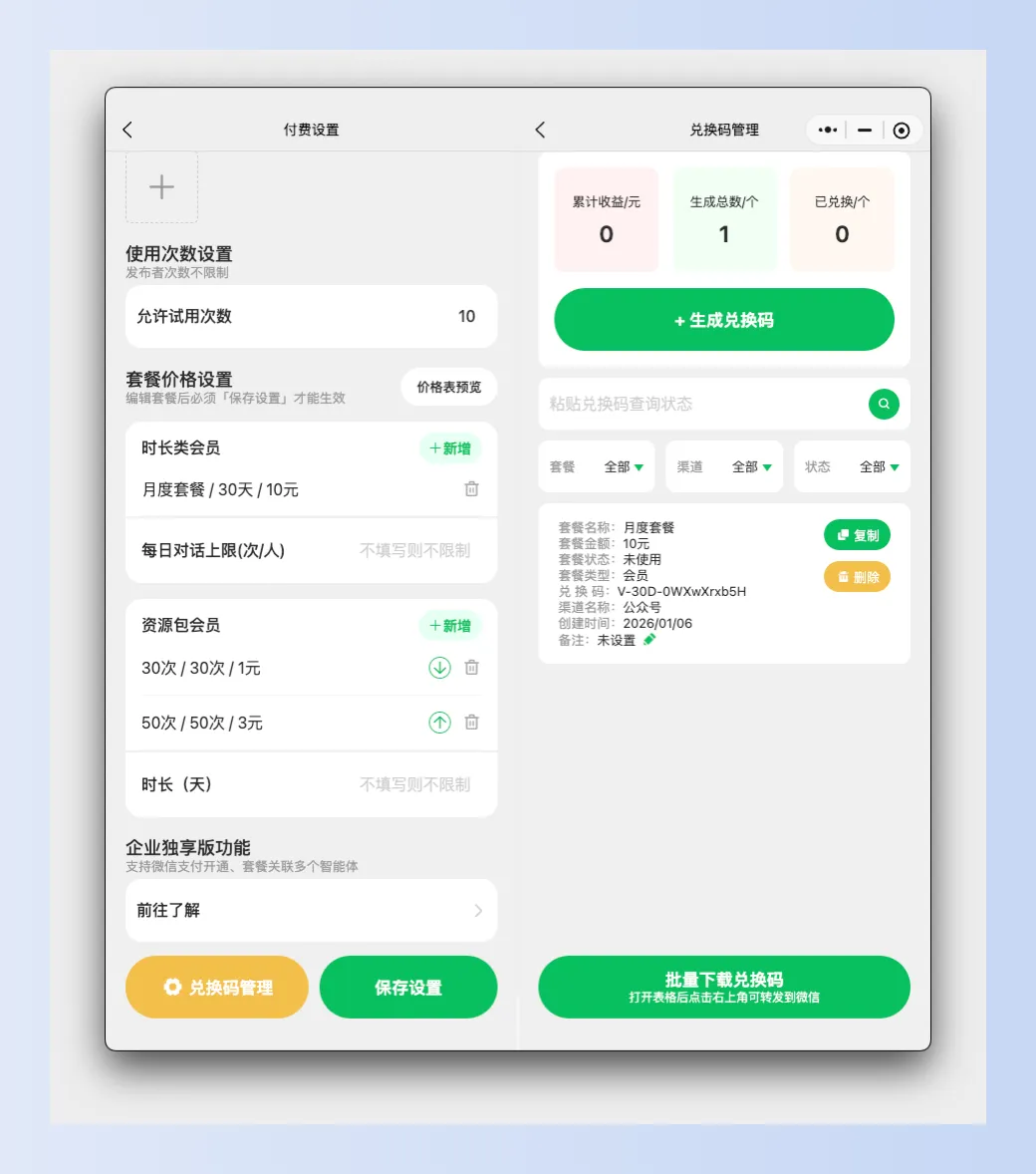 保存设置后,兑换码管理功能就可以使用了,可以方便地将套餐转换成兑换码,在不同的渠道发布。