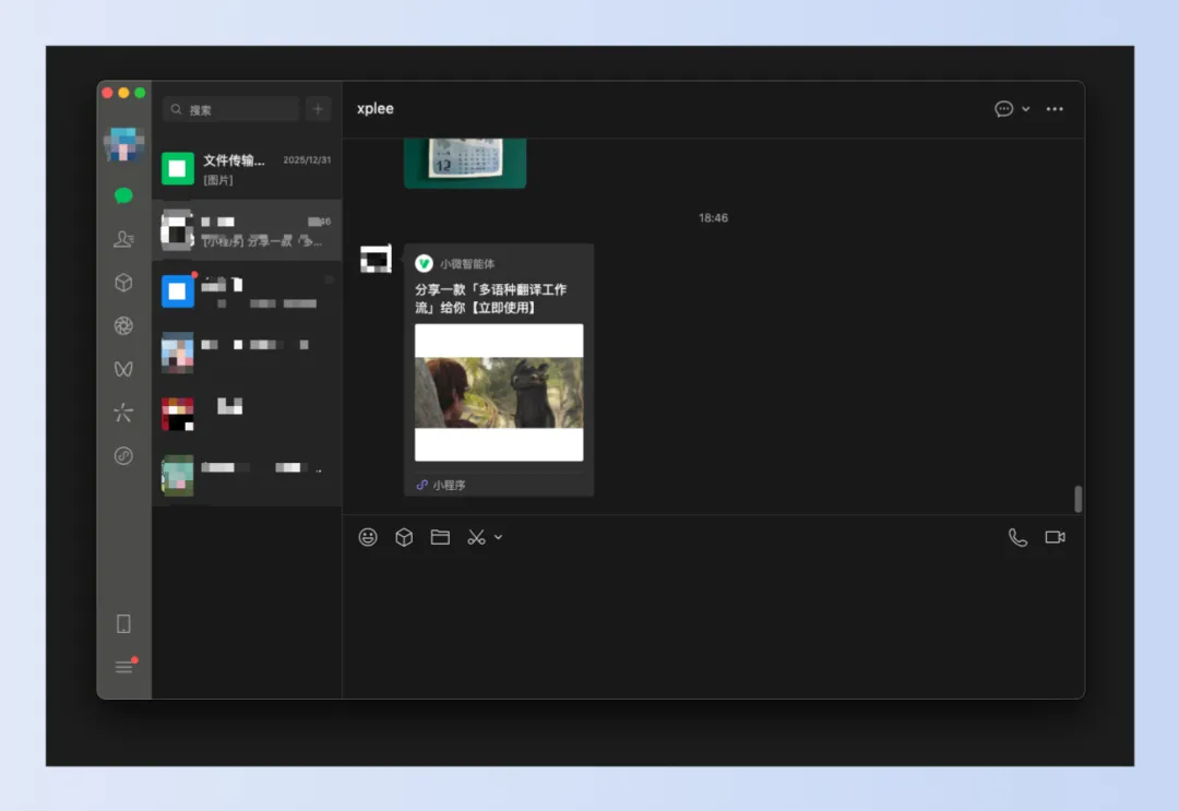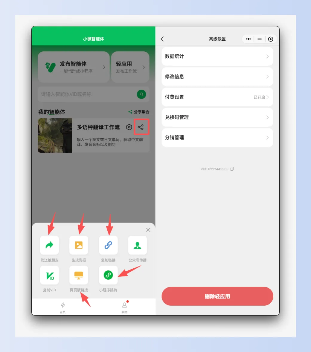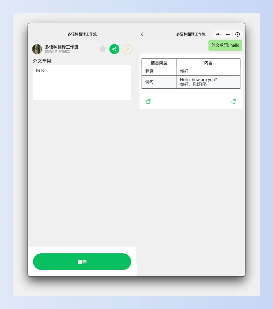 最后将这个工作流直接分享给其他人,其他人打开的就是个小程序,界面比较简单(输入+执行按钮)。也支持集成到其他小程序中,半屏拉起或直接跳转。