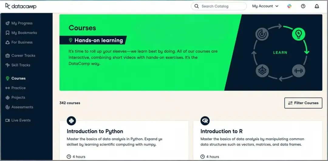 这应该是很多人都听过的教程,内容通俗易懂,从基础语法一路覆盖到进阶知识,每个知识点都配了示例代码,特别适合 Python 新手入门。3.DataCamp: