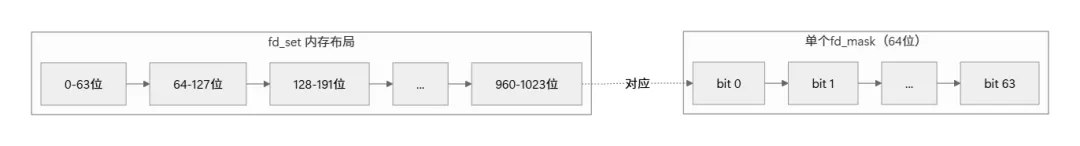 /* fd_set 在 glibc 中的定义(简化版) */#define __FD_SETSIZE 1024#define __NFDBITS (8 * (int) sizeof (__fd_mask))typedefstruct { __fd_mask fds_bits[__FD_SETSIZE / __NFDBITS];} fd_set;/* 关键宏定义 */#define FD_SET(fd, fdsetp) \ ((fdsetp)->fds_bits[(fd) / __NFDBITS] |= (1UL << ((fd) % __NFDBITS)))#define FD_CLR(fd, fdsetp) \ ((fdsetp)->fds_bits[(fd) / __NFDBITS] &= ~(1UL << ((fd) % __NFDBITS)))#define FD_ISSET(fd, fdsetp) \ (((fdsetp)->fds_bits[(fd) / __NFDBITS] & (1UL << ((fd) % __NFDBITS))) != 0)#define FD_ZERO(fdsetp) \ memset((fdsetp), 0, sizeof(*(fdsetp)))