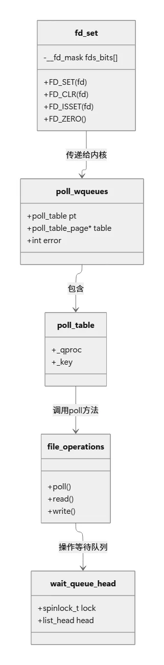 // Linux 内核 select 实现的核心逻辑(简化版)SYSCALL_DEFINE5(select, int, n, fd_set __user *, inp, fd_set __user *, outp, fd_set __user *, exp, struct timeval __user *, tvp){struct timespec end_time, *to = NULL; fd_set_bits fds; // 1. 超时时间处理 if (tvp) { time_t sec = tvp->tv_sec; suseconds_t usec = tvp->tv_usec; // 转换为内核时间格式... } // 2. 从用户空间复制 fd_set ret = core_sys_select(n, inp, outp, exp, to, &fds); // 3. 核心轮询逻辑 ret = do_select(n, &fds, to); // 4. 将结果复制回用户空间 if (set_fd_set(n, inp, fds.res_in) || set_fd_set(n, outp, fds.res_out) || set_fd_set(n, exp, fds.res_ex)) ret = -EFAULT; return ret;}