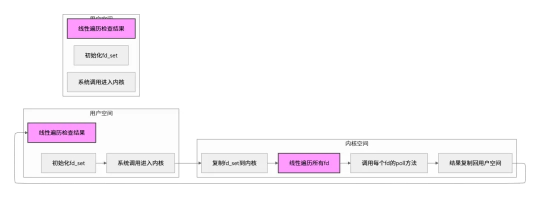 用户空间准备fd_set → 系统调用进入内核 → 内核复制数据 → 遍历所有fd调用poll → 等待或返回 → 结果复制回用户空间 → 用户遍历检查结果