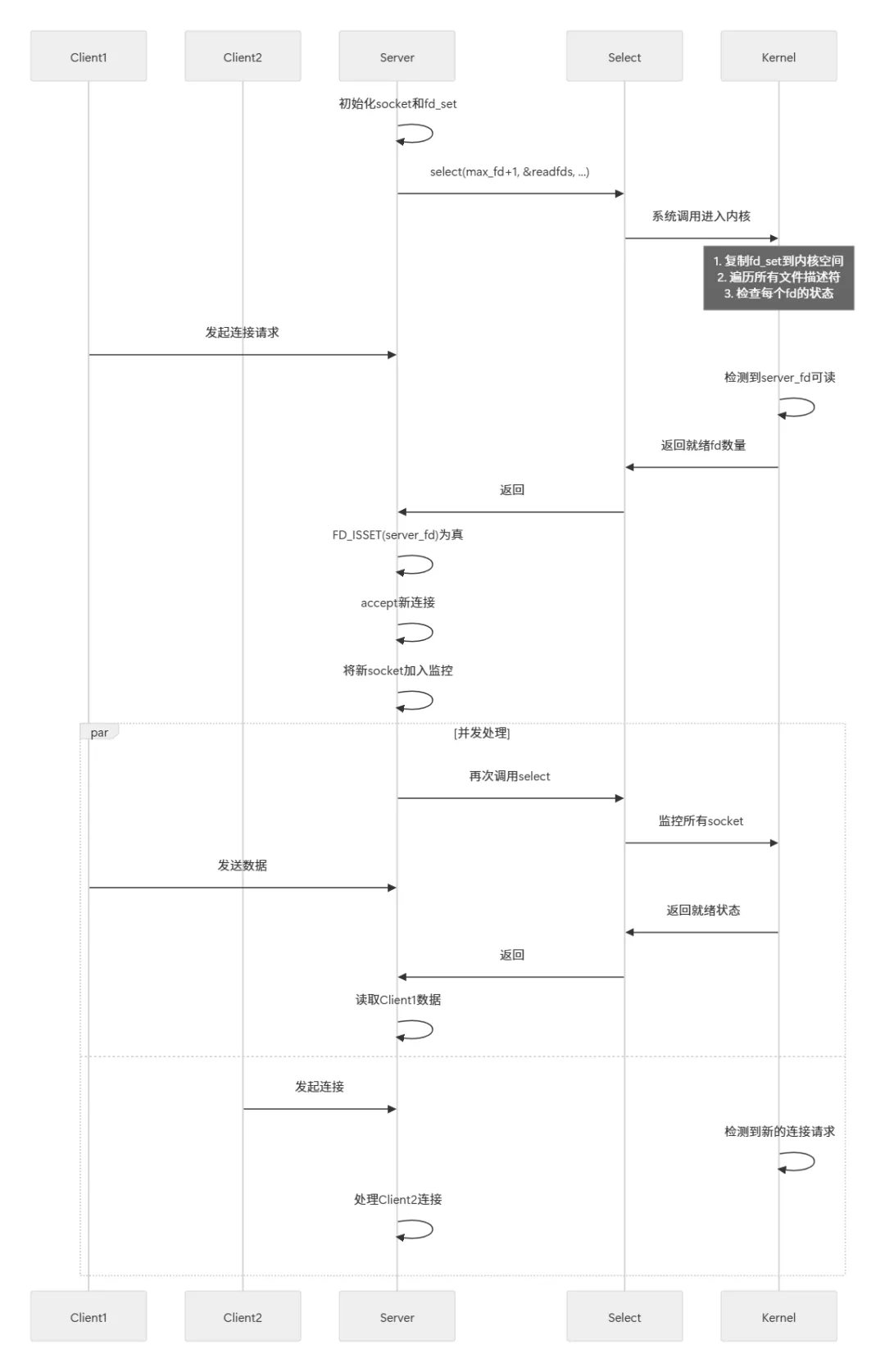 // 每次调用都需要完整的复制过程select(..., &readfds, ...); // 用户空间->内核空间// 内核修改后// 内核空间->用户空间