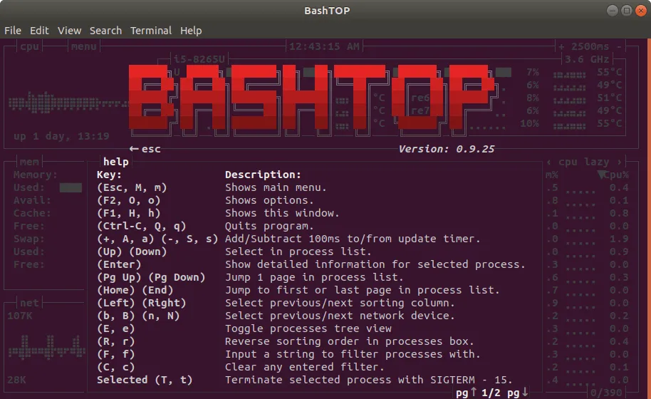 它带有游戏风格的响应式终端UI和可自定义的菜单。各种显示部分的整齐排列使监视各种系统指标变得容易。Bashtop是Linux中基于终端的资源监控实用程序。它是一个漂亮的命令行工具,可以直观地显示CPU、内存、正在运行的进程和带宽的统计数据。