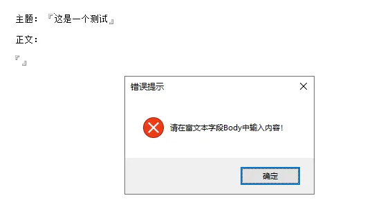 Msgbox "请在富文本字段Body中输入内容!", 16, "错误提示"