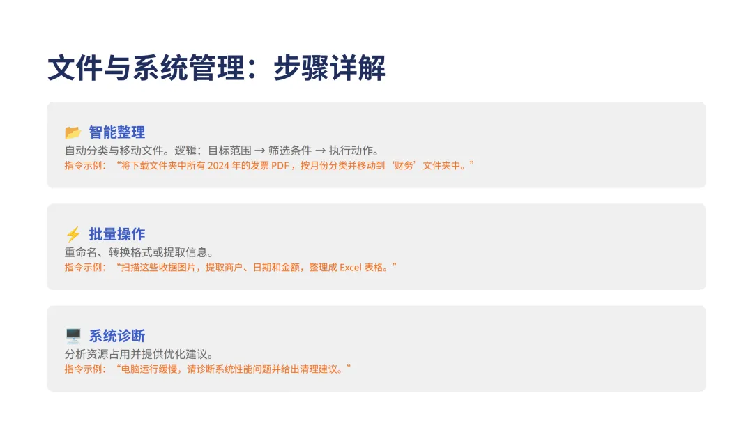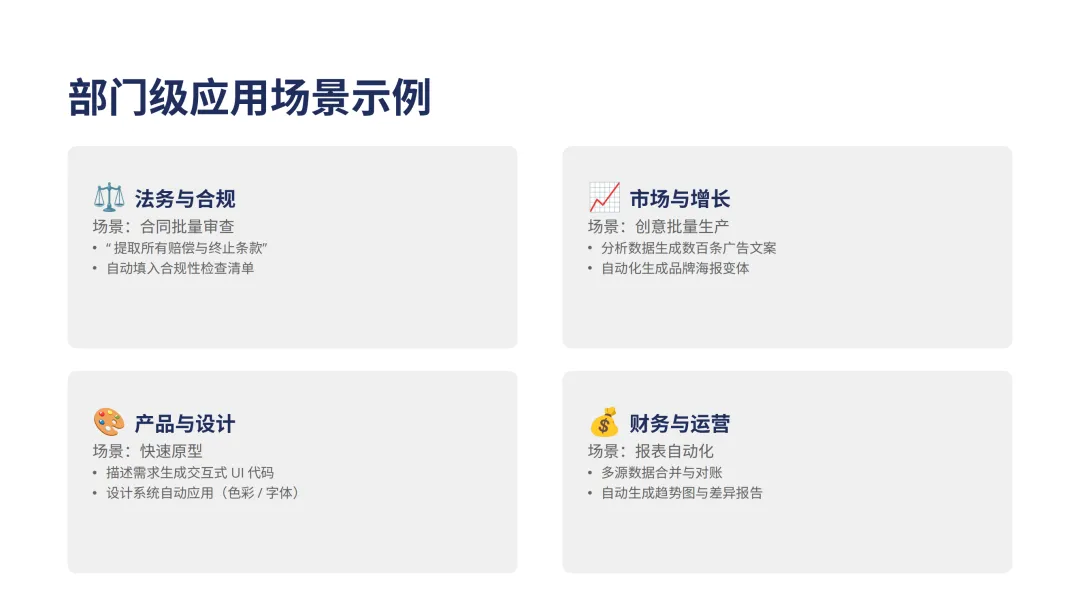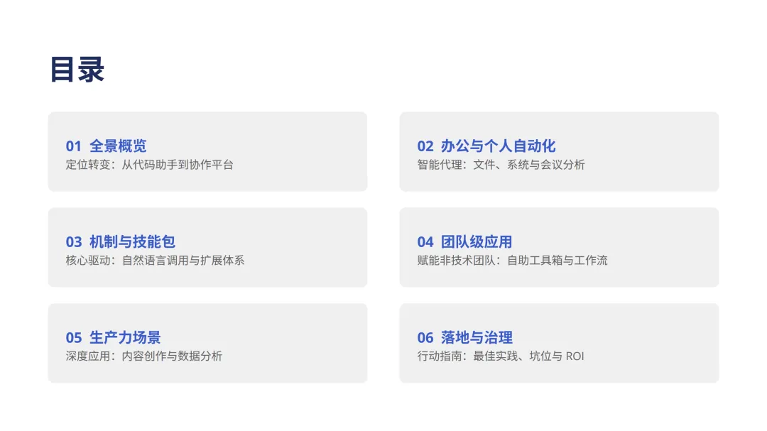 现在它能做的远不止写代码:办公与个人事务自动化,像整理文件夹、诊断系统、下载剪辑视频、分析会议录音;赋能法律、营销、财务等团队,自助做应用、生成创意、处理数据;还能批量编辑文档、爬数据、剪视频、做网页;甚至让不懂脚本的人用自然语言做数据清洗、分析、出报告。本质是换了干活方式——不用学软件操作,说清“要什么”就行。你从“软件操作员”变“流程指挥官”,剩下交给AI。它已是普通人管电脑、团队提效、创作者生产的通用数字搭档。👉谢谢您的关注,后台留言私信第一时间获取完整PPT