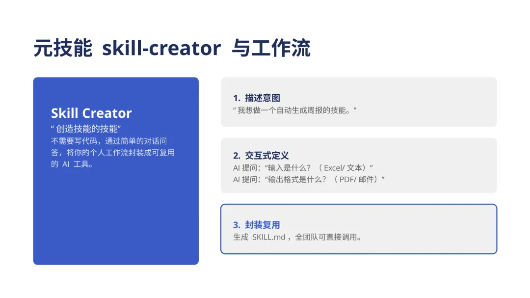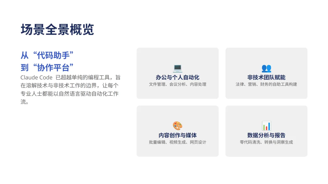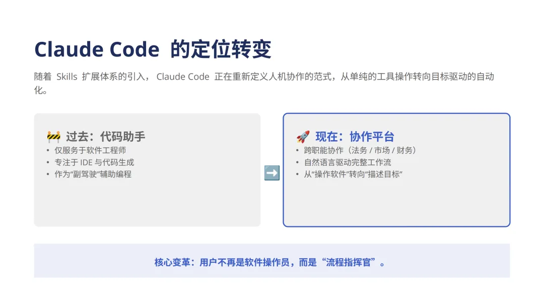 最近AI圈吹爆的Claude Code+Skill到底有什么魔力火出圈了?做为非程序工作者又有那些应用场景?Claude Code 已从“AI结对编程助手”进化成功能全面的协作平台。把它变成“全面AI协作平台”,支持无代码开发、项目管理,服务技术与非技术用户。核心是“溶解技术与非技术工作的边界”,让非技术人用自然语言直接建工具、自动化流程。