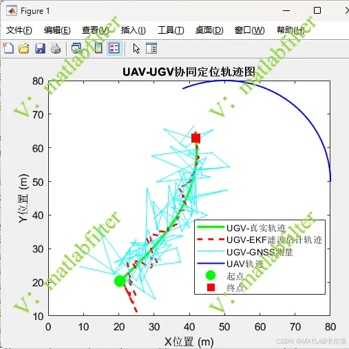 %% UAV辅助的UGV协同定位仿真% UAV通过测距测角辅助UGV进行精确定位% 作者:matlabfilter(V同号,可接导航、定位相关的代码定制)% 2026-01-07/Ver1clear; close all; clc;rng(0);%% 仿真参数设置dt =0.1;% 时间步长 (s)T =10;% 总仿真时间 (s)steps = T/dt;% 仿真步数% UAV参数uav_altitude =50;% 飞行高度 (m)uav_orbit_radius =30;% 轨道半径 (m)uav_angular_vel =0.2;% 角速度 (rad/s)uav_pos =[50;50];% 初始位置 [x; y] (m)% UGV参数ugv_real_pos =[20;20];% 真实初始位置 (m)ugv_est_pos =[20.5;20.5];% 估计初始位置 (m)ugv_velocity =5;% 速度 (m/s)ugv_heading =pi/4;% 航向角 (rad)% 噪声参数noise_process =0.1;% 过程噪声标准差noise_measure_dist =1;% 距离测量噪声标准差 (m)noise_measure_ang =0.1;% 角度测量噪声标准差 (rad)noise_GNSS =5;% GNSS噪声标准差 (m)