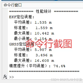 仿真过程中完整记录了 UAV 轨迹、UGV 真实轨迹、滤波估计轨迹以及 GNSS 测量轨迹,并从空间轨迹、分轴位移和定位误差三个层面对结果进行可视化分析。通过对 EKF 融合结果与 GNSS 单独定位结果的误差统计对比,可以直观评估 UAV 辅助协同定位在平均误差、稳定性和极值误差方面的性能提升效果。